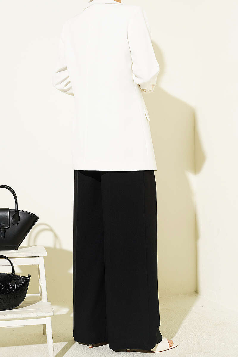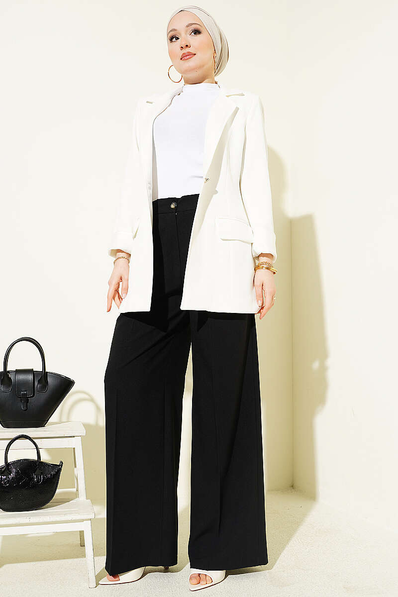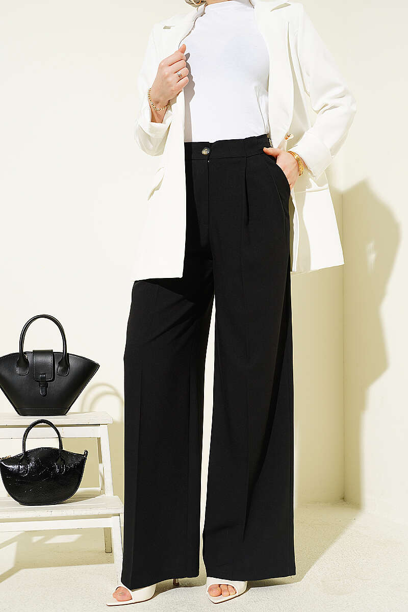 Kemerli Düğmeli Geniş Paça Pantolon Siyah