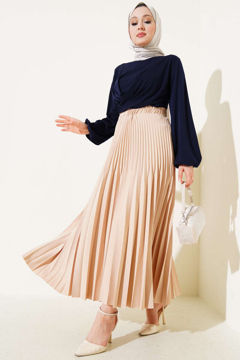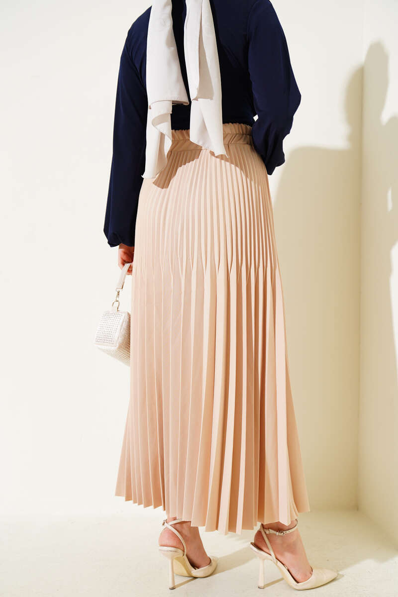 Saten Görünümlü Pileli Etek Bej