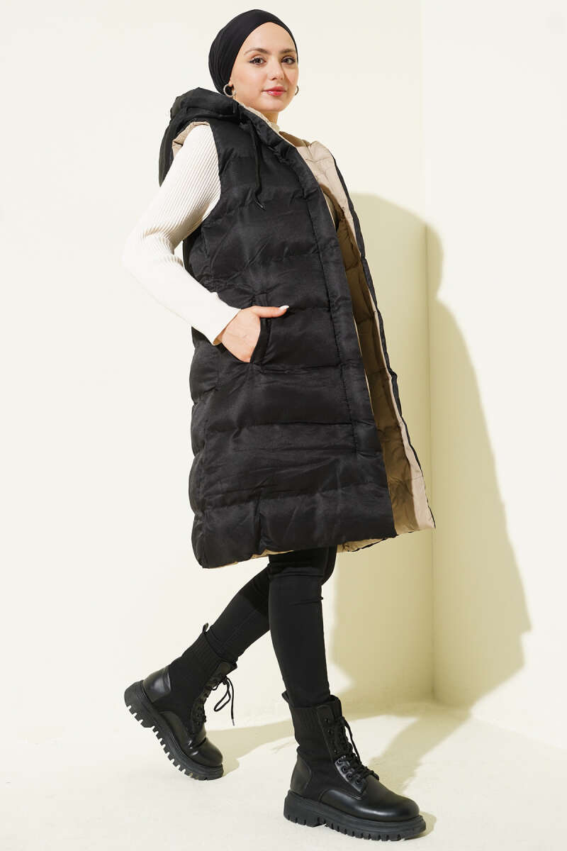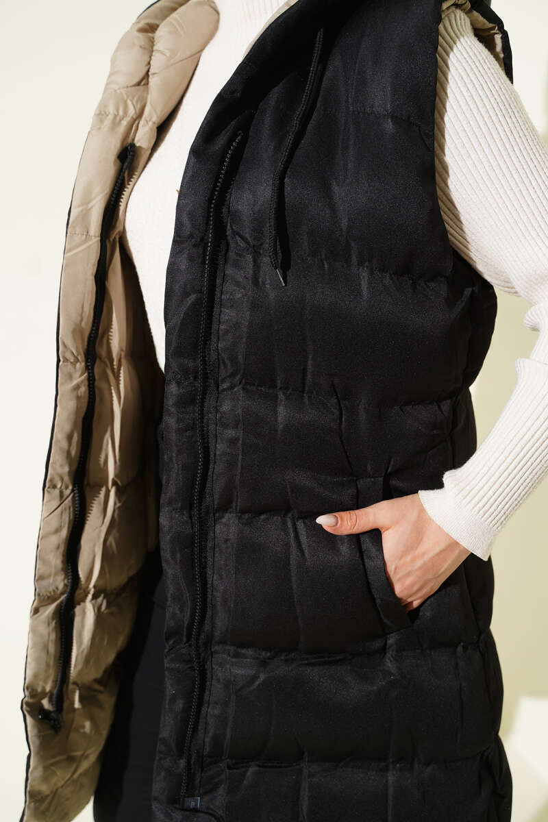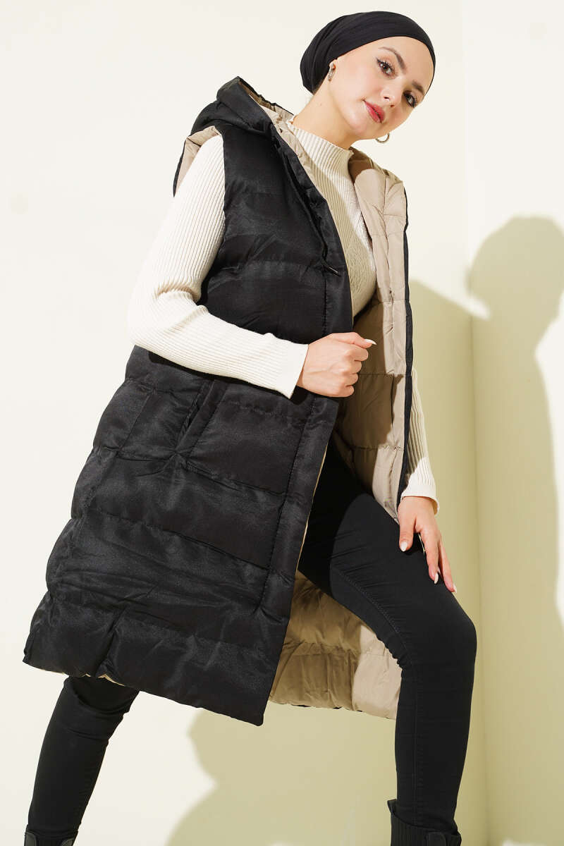 Yeni sezon model şişme yeleğimiz çift taraflı kullanıma uygundur. Bir tarafı bej, bir tarafı siyah olan şişme yeleğimiz fermuarlıdır. Kapüşonlu olan şişme yeleğimiz sportif şıklığı sizlere sunmaktadır. Çamaşır makinesinde yıkamayınız! kuru temizleme yapınız.