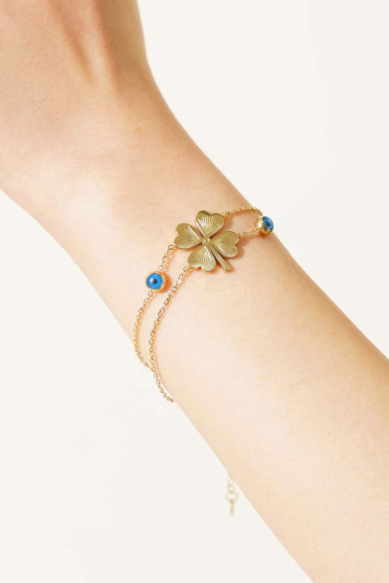 Çift Zincirli Yonca ve Nazar Boncuğu Detaylı Bileklik Gold