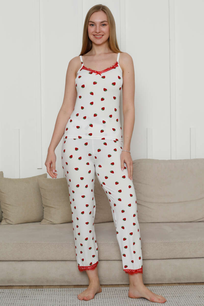 Çilek Baskılı Askılı Pijama Takımı Beyaz