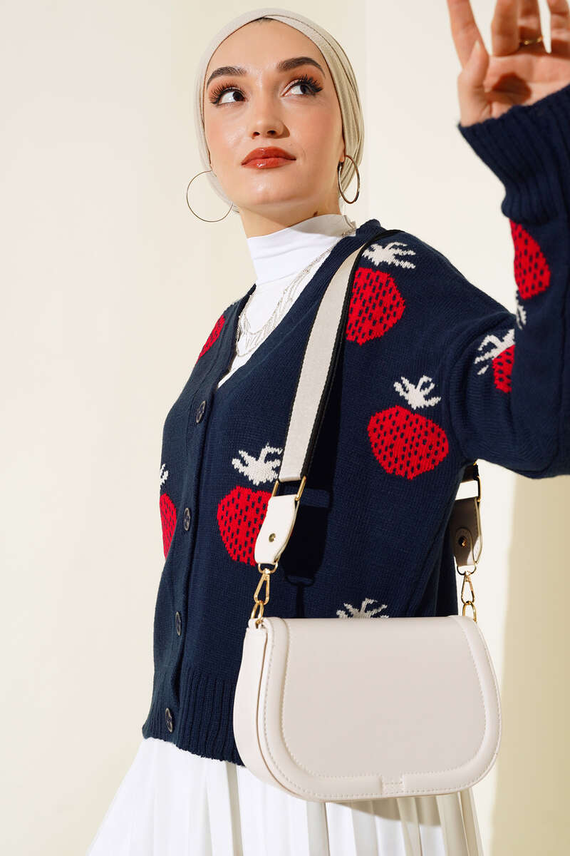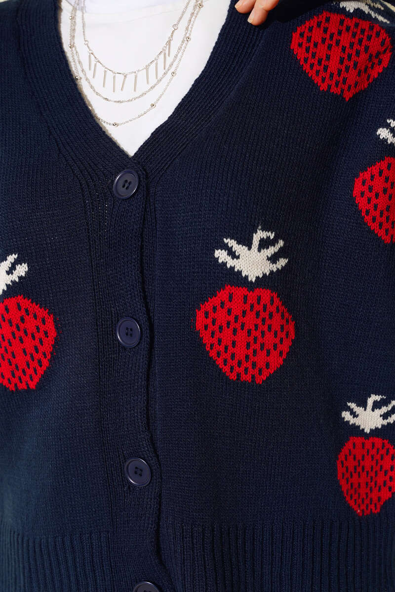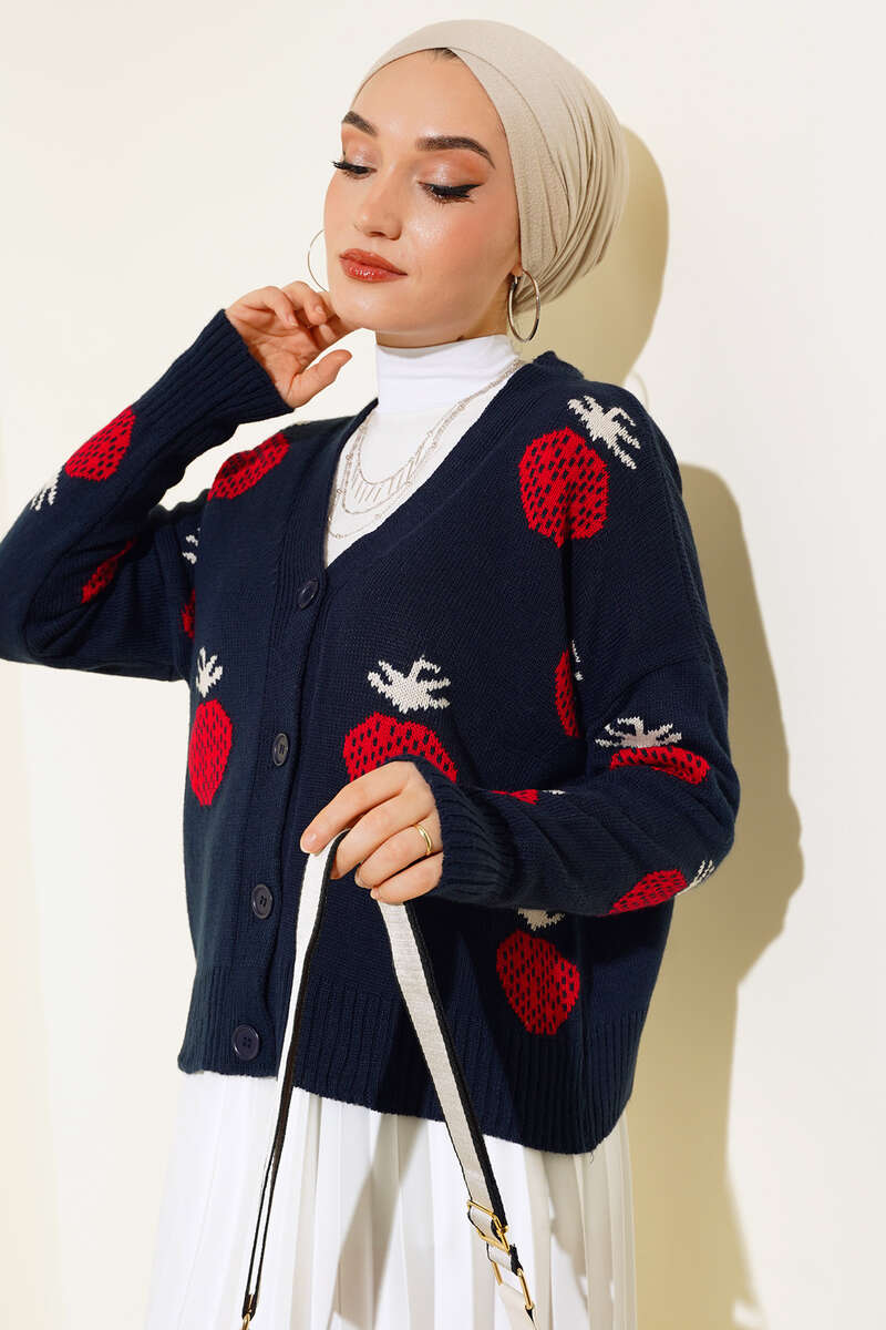 Sezonun çarpıcı parçası olan hırkamızı çok beğeneceksiniz. Hırkamız çilek desenlidir. Hırkamız düğmelidir. Uzun kolludur. Hırkamız kısadır. Sade ve sportif model hırkamız kombinlerinizin favori parçası olacaktır.