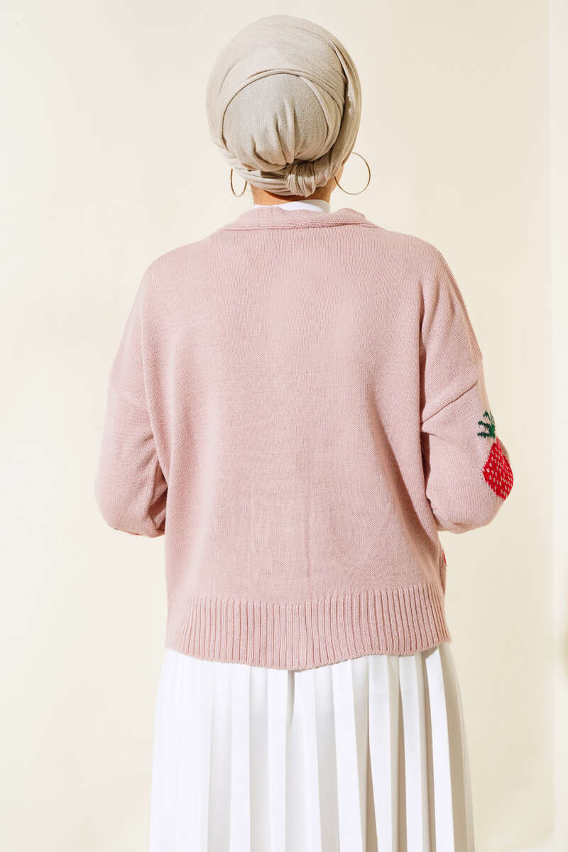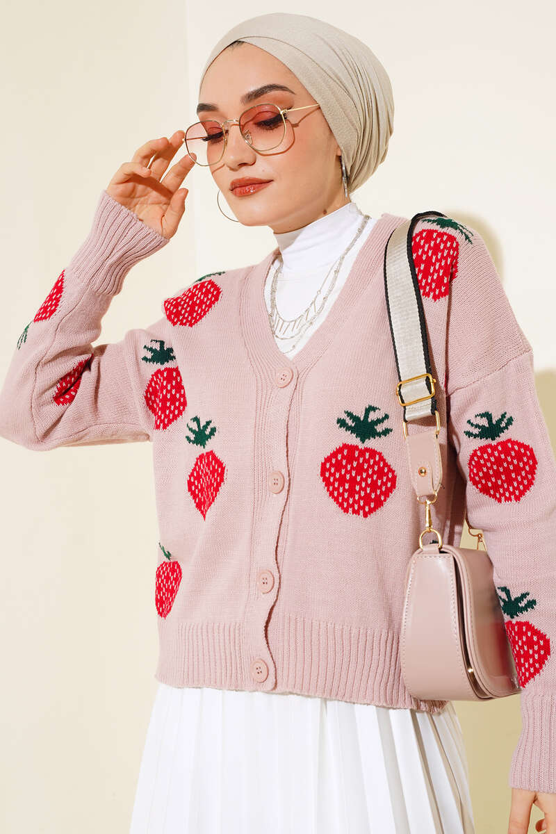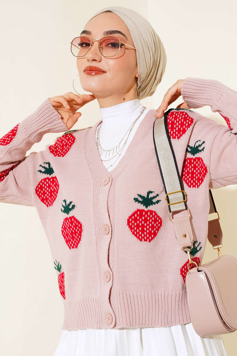 Çilek Desen Kısa Hırka Pudra