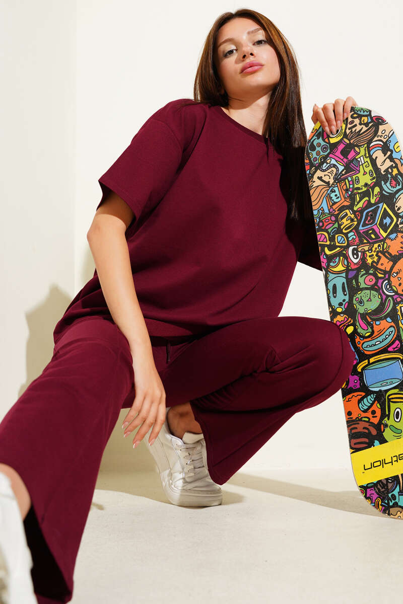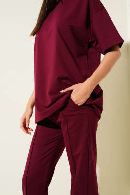 Çıma Detaylı Kısa Kol İkili Takım Bordo