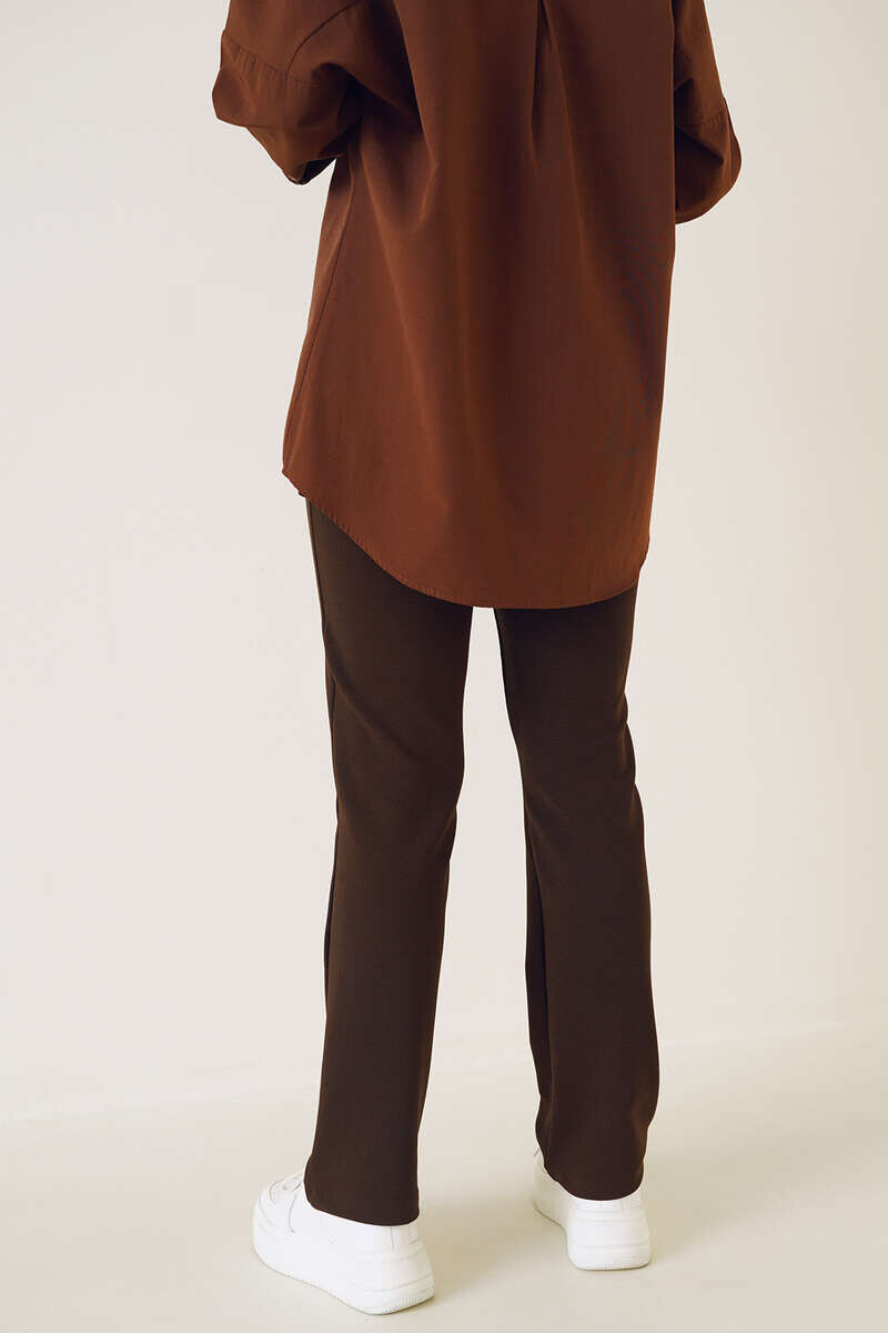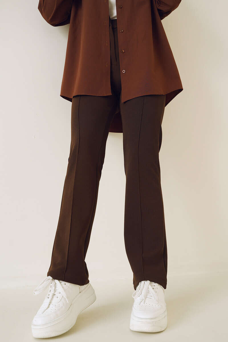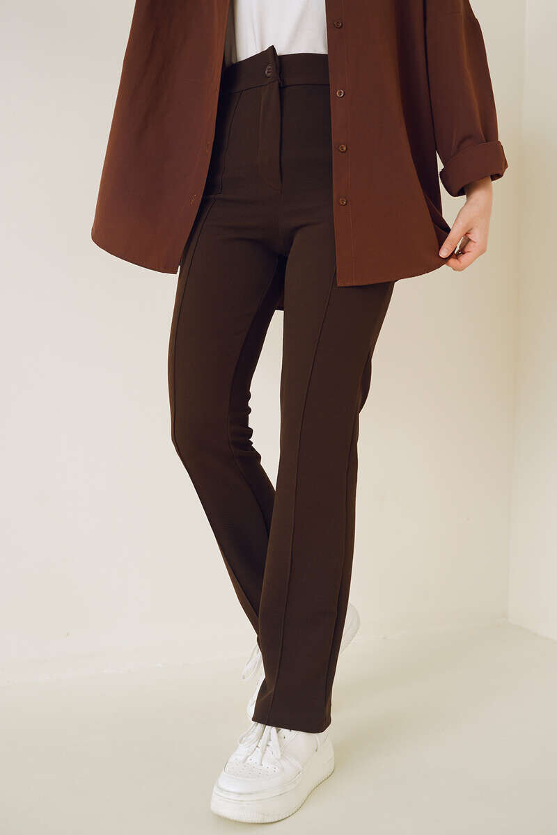 Yeni sezon pantolonumuzun önü çımalıdır. Boru paça pantolonumuz düğmeli ve fermuarlıdır. Esnek kumaşı sayesinde şık bir duruşa sahip pantolonumuz kombinlerinizin tamamlayıcı parçası olacaktır.