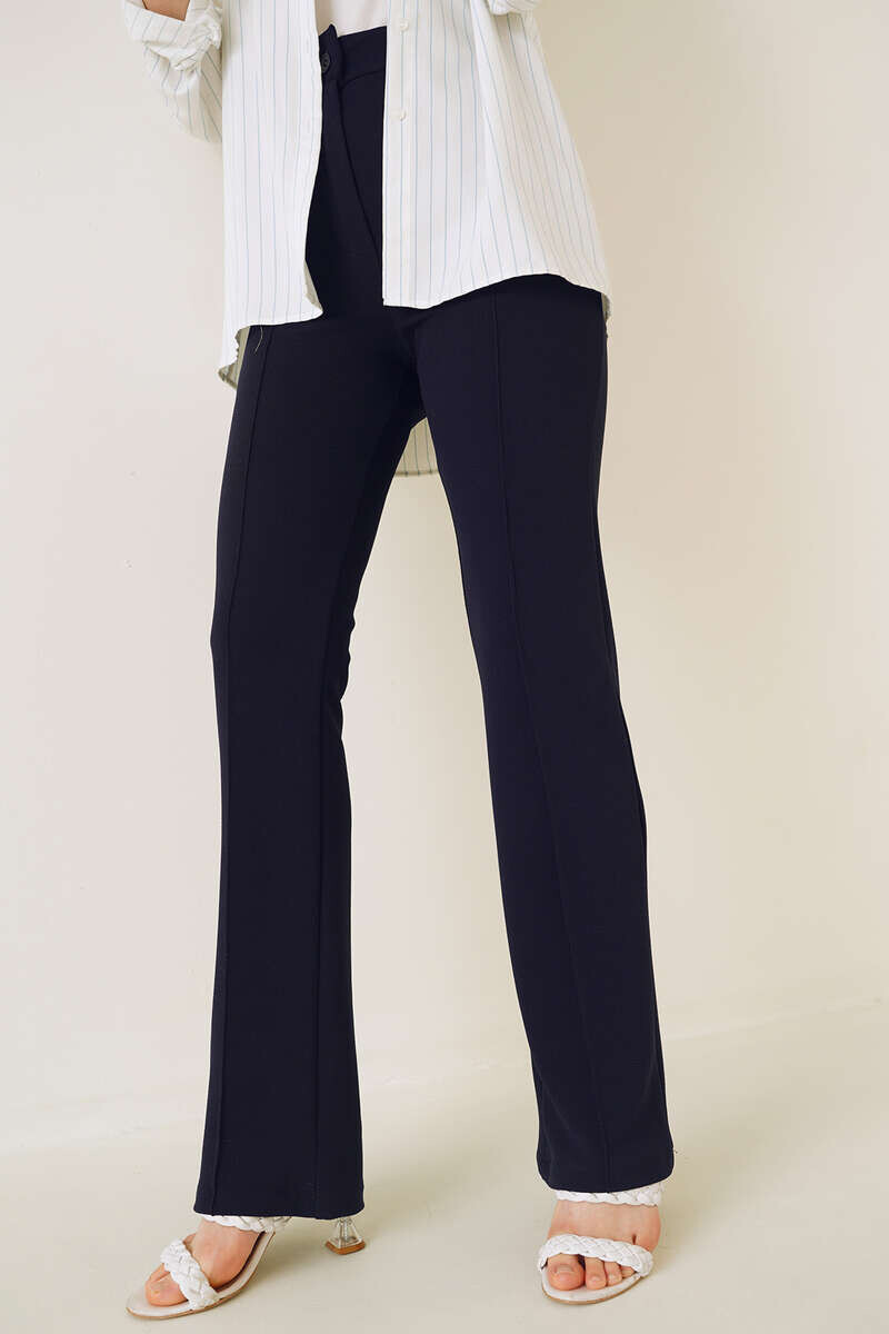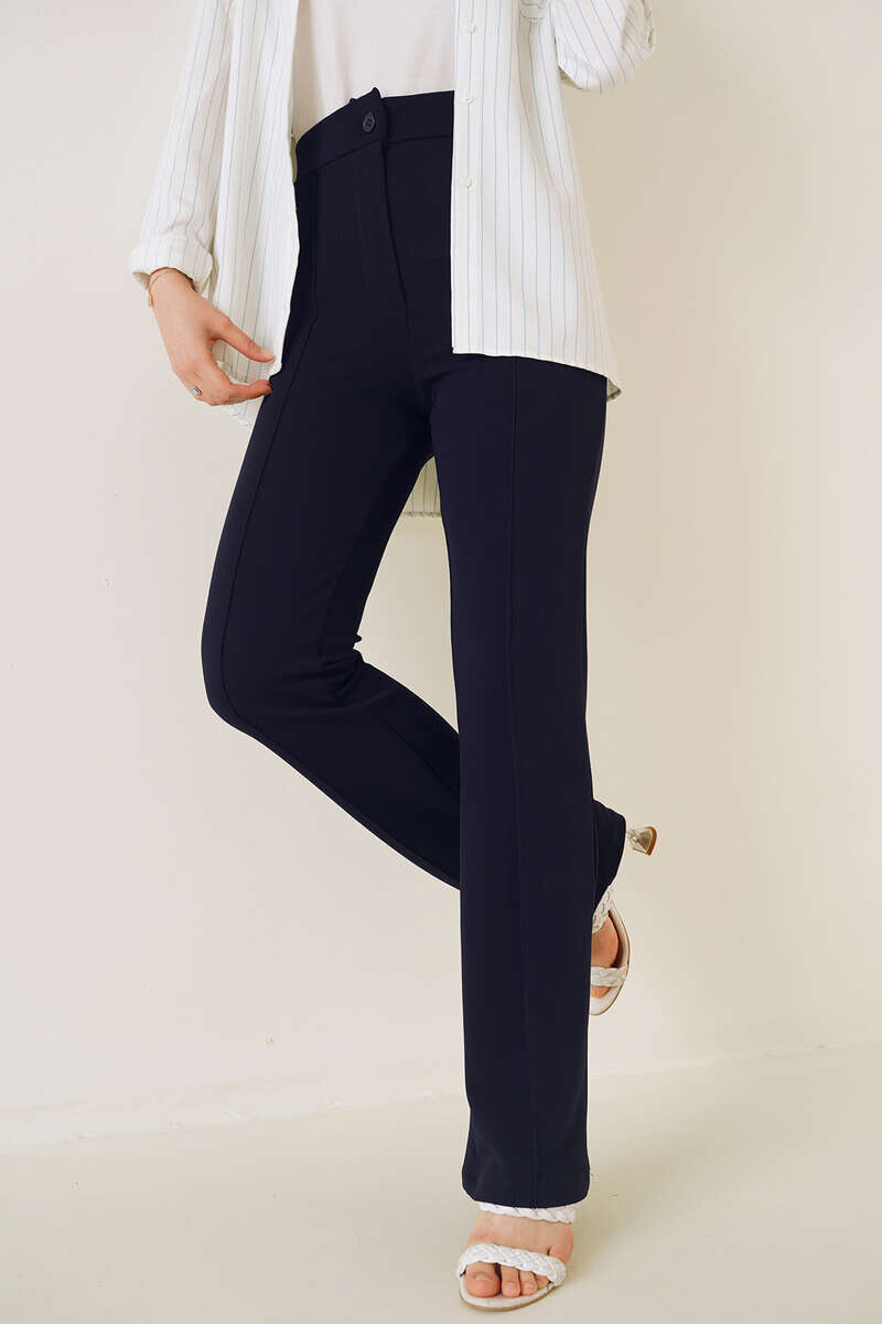 Yeni sezon pantolonumuzun önü çımalıdır. Boru paça pantolonumuz düğmeli ve fermuarlıdır. Esnek kumaşı sayesinde şık bir duruşa sahip pantolonumuz kombinlerinizin tamamlayıcı parçası olacaktır.