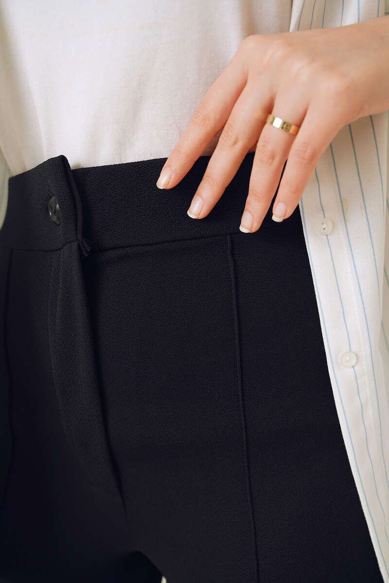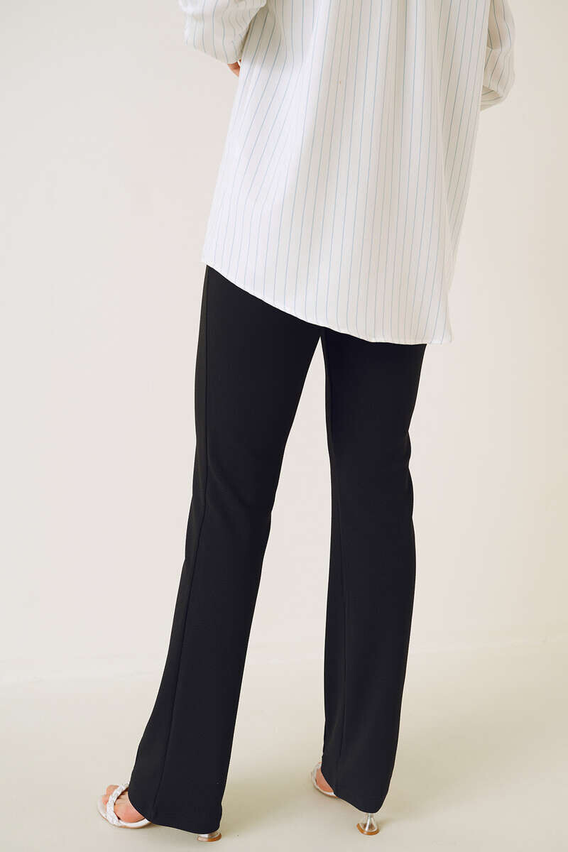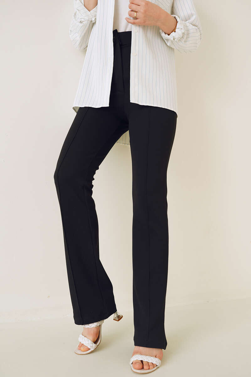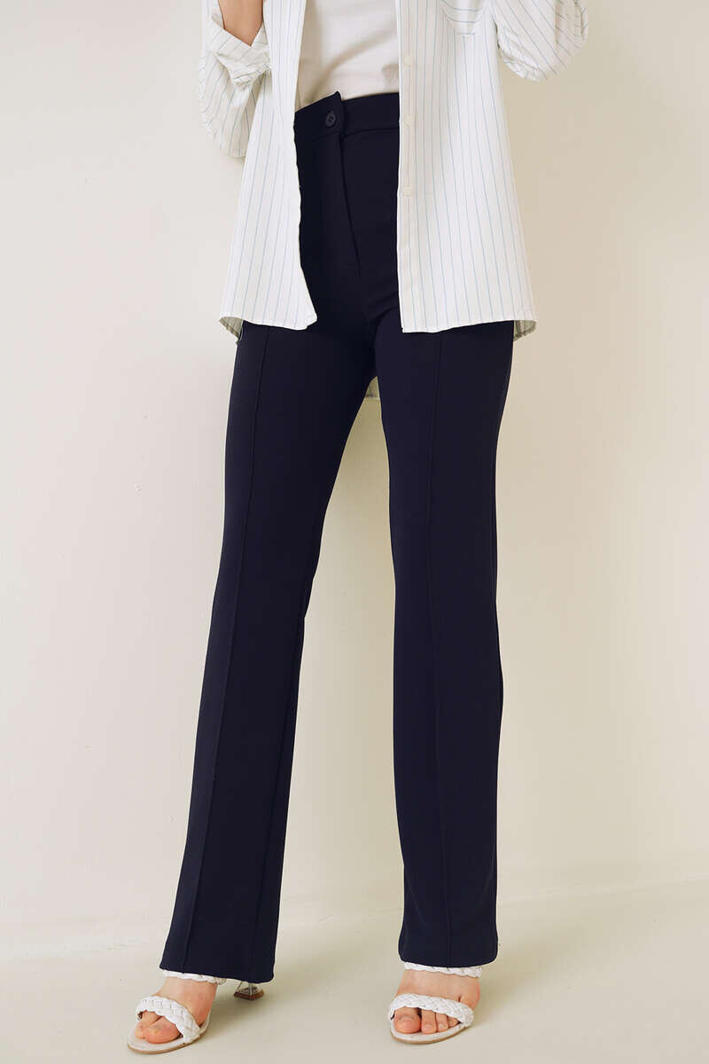 Yeni sezon pantolonumuzun önü çımalıdır. Boru paça pantolonumuz düğmeli ve fermuarlıdır. Esnek kumaşı sayesinde şık bir duruşa sahip pantolonumuz kombinlerinizin tamamlayıcı parçası olacaktır.