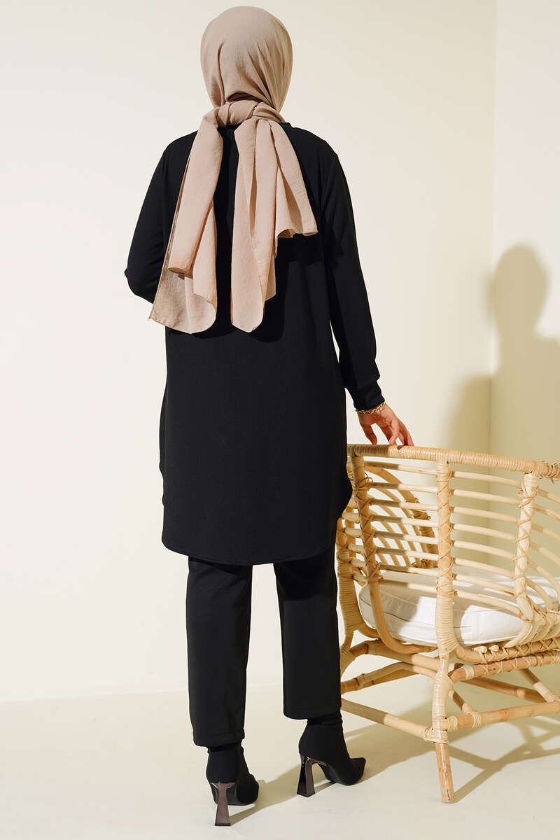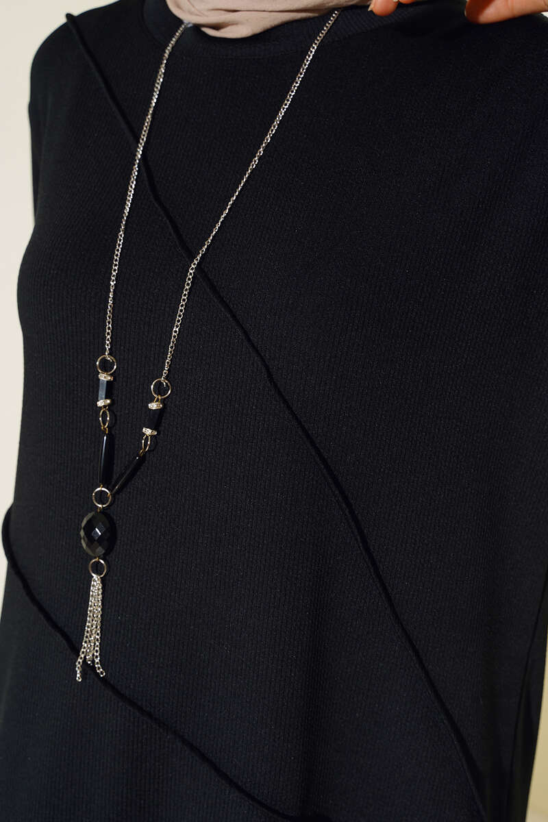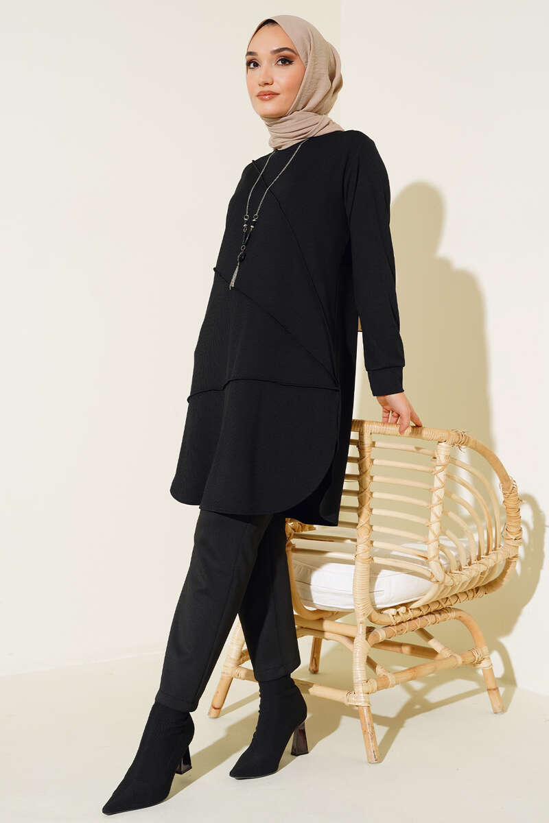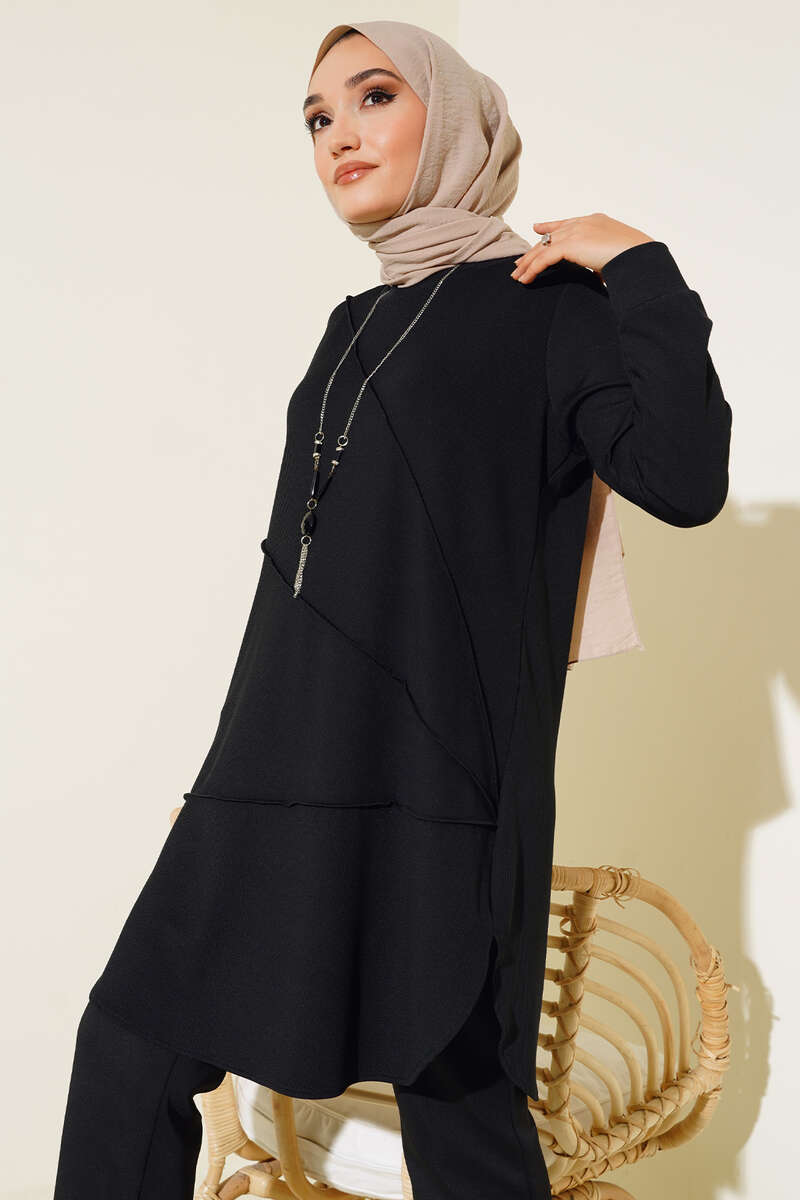 Yeni modeller arasında olan tuniğimiz tasarımı ve rahatlığı ile dikkat çekmekte. Tuniğimiz çimalı modeldir. Etek kısmı oval kesime sahiptir. Taşlı zincir kolyesi mevcuttur. Renk seçenekleri bulunmaktadır.