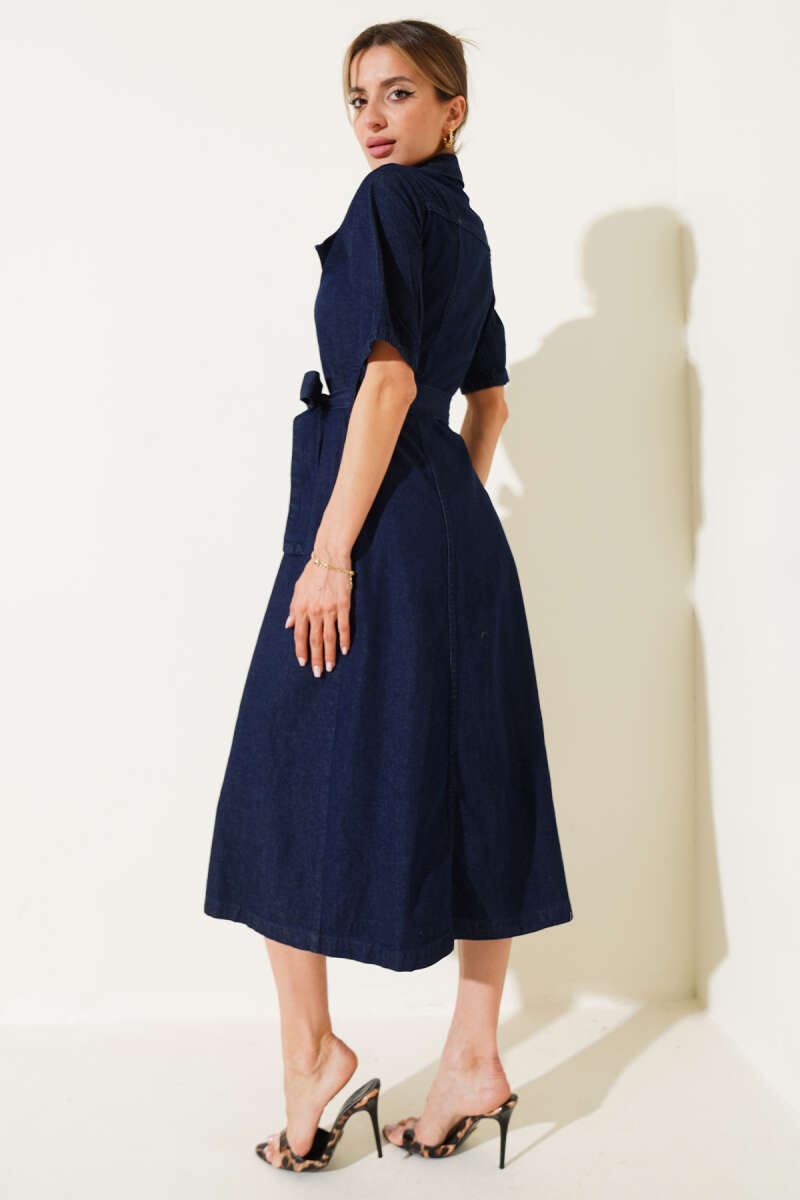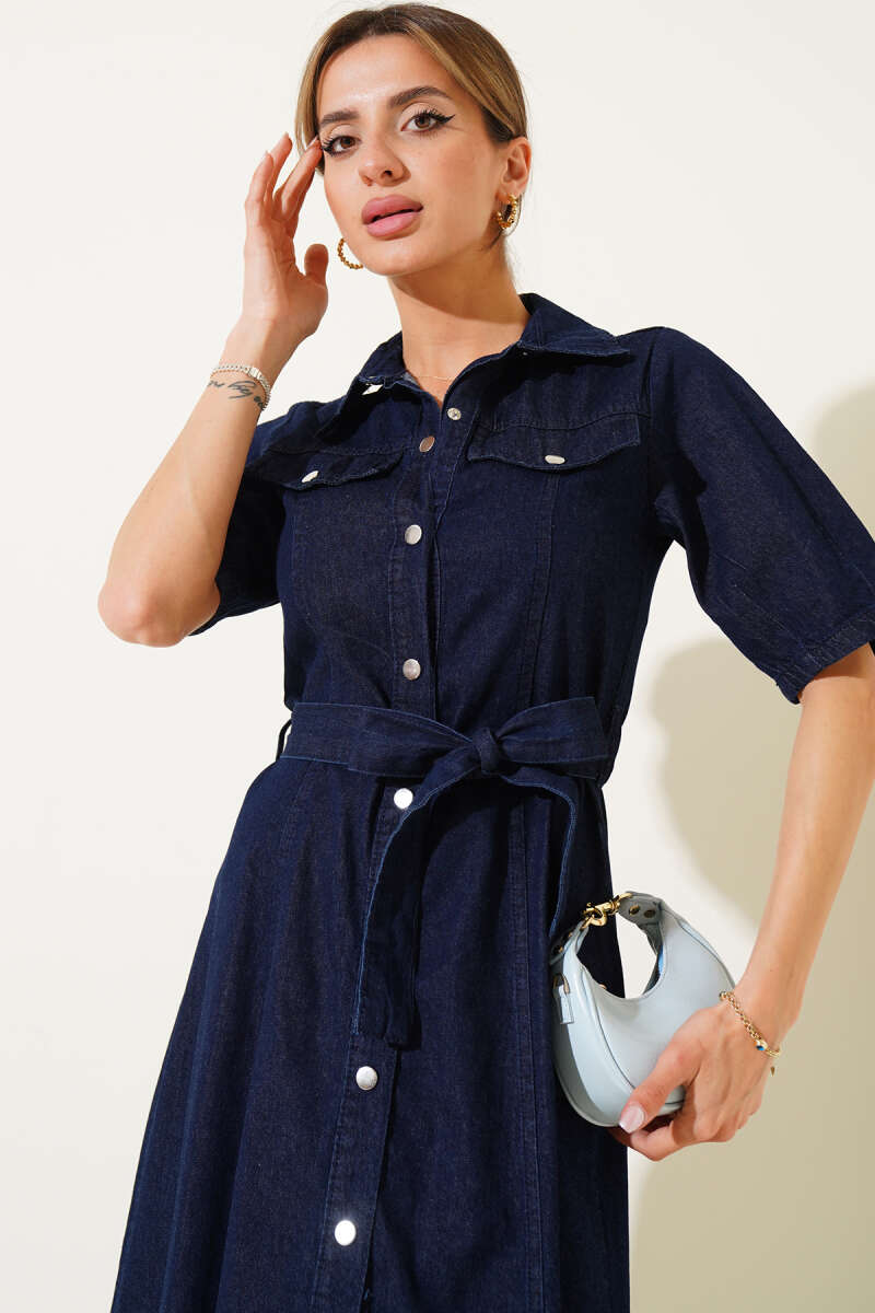 Çırçıt Düğmeli Kısa Kol Kot Midi Elbise Lacivert