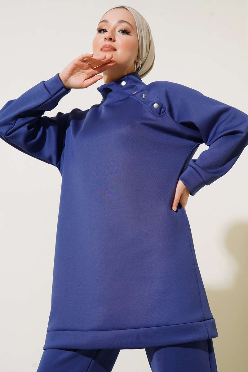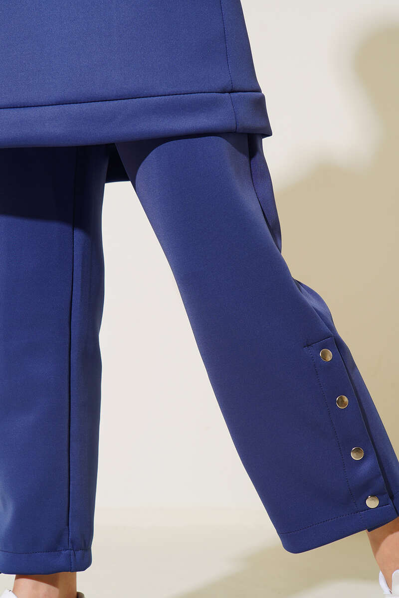 İkili takımızın pantolon ve tunik olarak iki parçadan oluşmaktadır. Tuniğimiz dik yakalı olup scuba kumaştır. Tuniğin yaka kısmında bulunan çıt çıt düğme detayları pantolon paçasında da devam etmektedir. Pantolon bol paçalı ve beli lastiklidir.