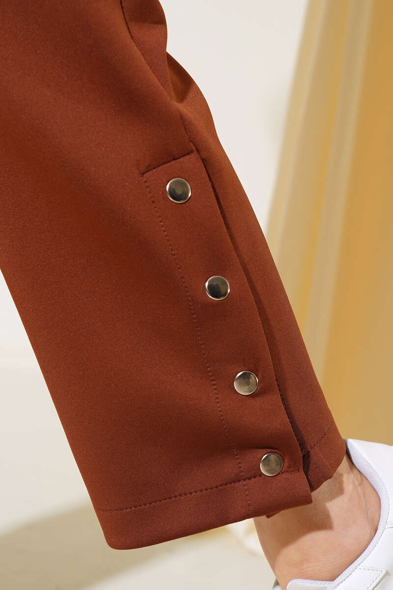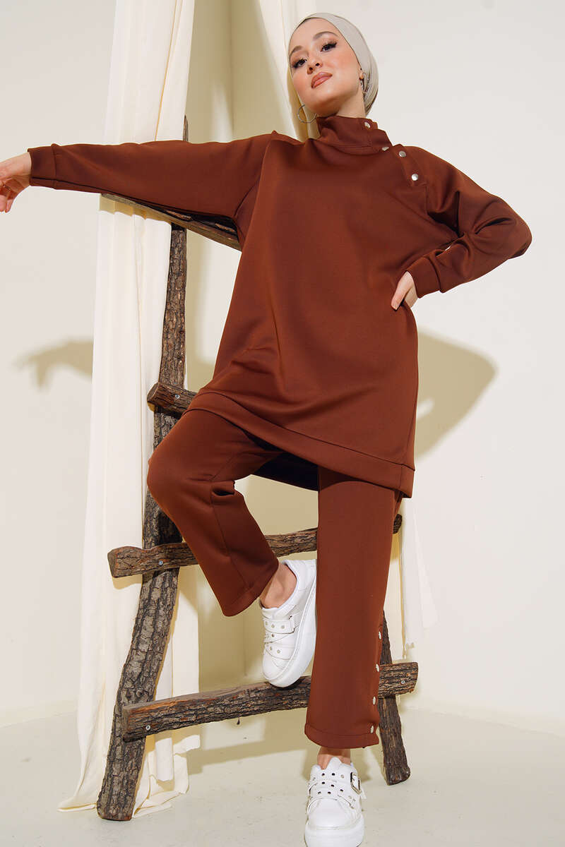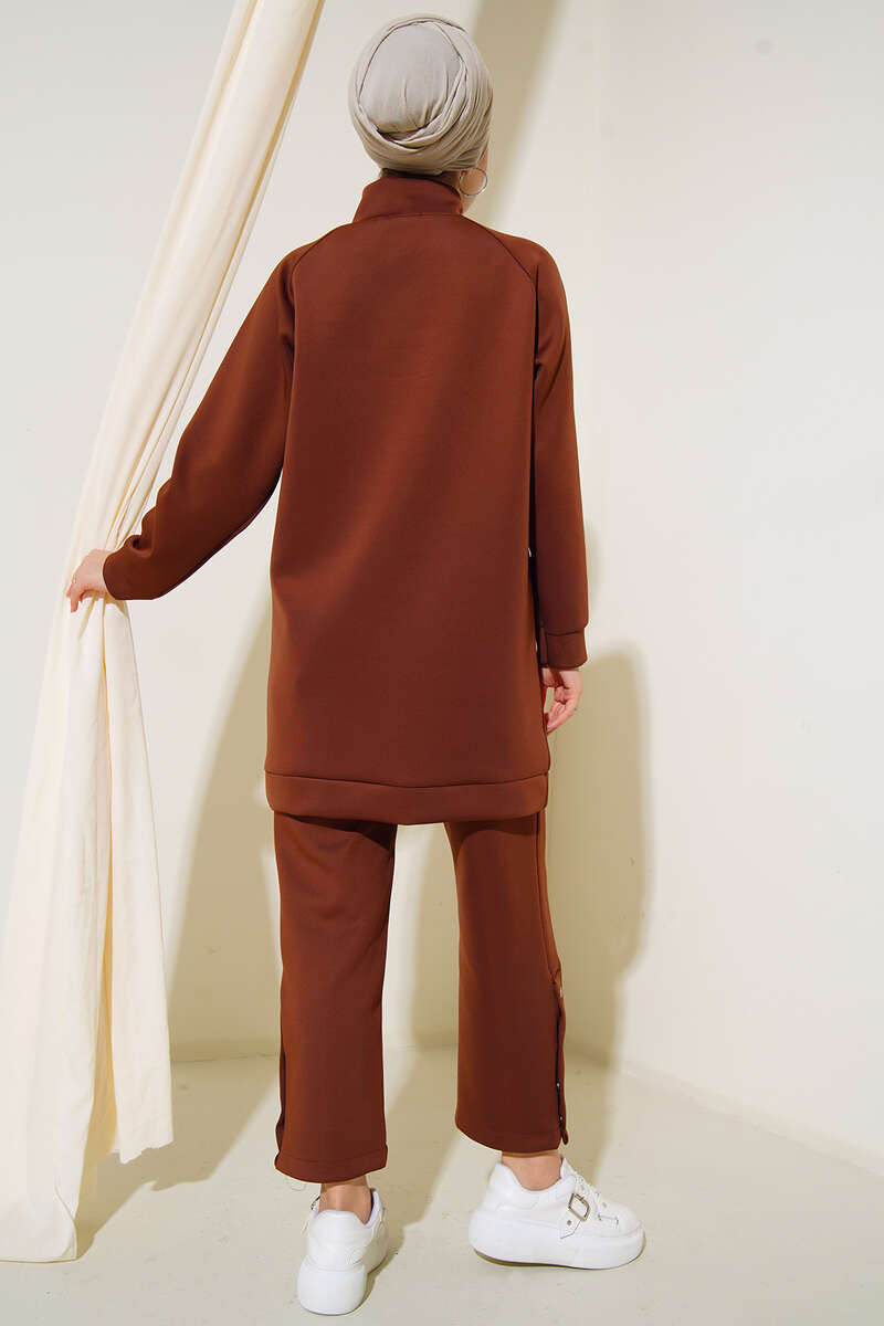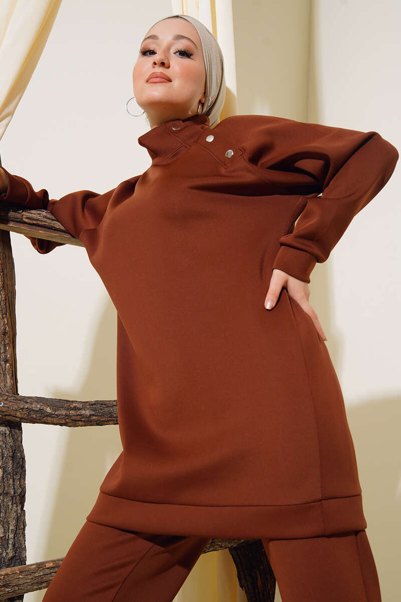 İkili takımızın pantolon ve tunik olarak iki parçadan oluşmaktadır. Tuniğimiz dik yakalı olup scuba kumaştır. Tuniğin yaka kısmında bulunan çıt çıt düğme detayları pantolon paçasında da devam etmektedir. Pantolon bol paçalı ve beli lastiklidir.