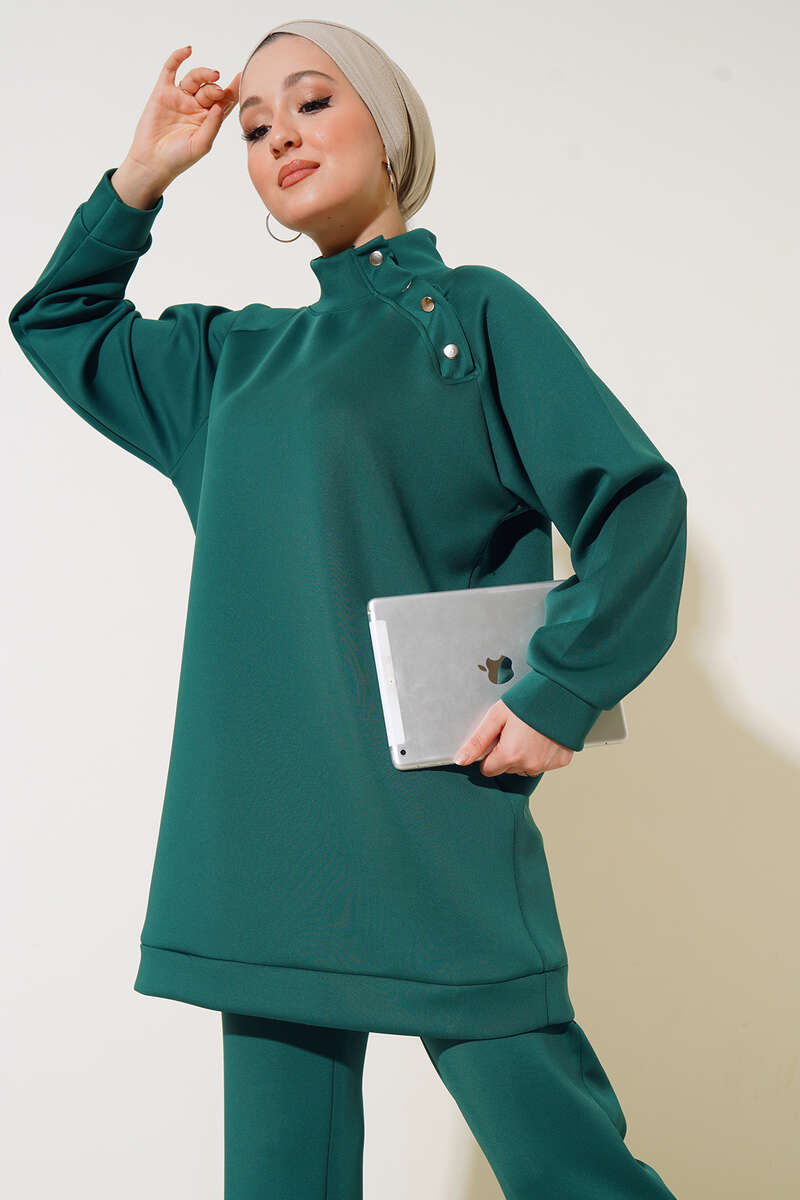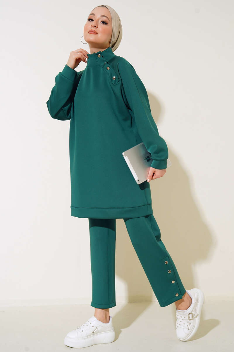 İkili takımızın pantolon ve tunik olarak iki parçadan oluşmaktadır. Tuniğimiz dik yakalı olup scuba kumaştır. Tuniğin yaka kısmında bulunan çıt çıt düğme detayları pantolon paçasında da devam etmektedir. Pantolon bol paçalı ve beli lastiklidir.