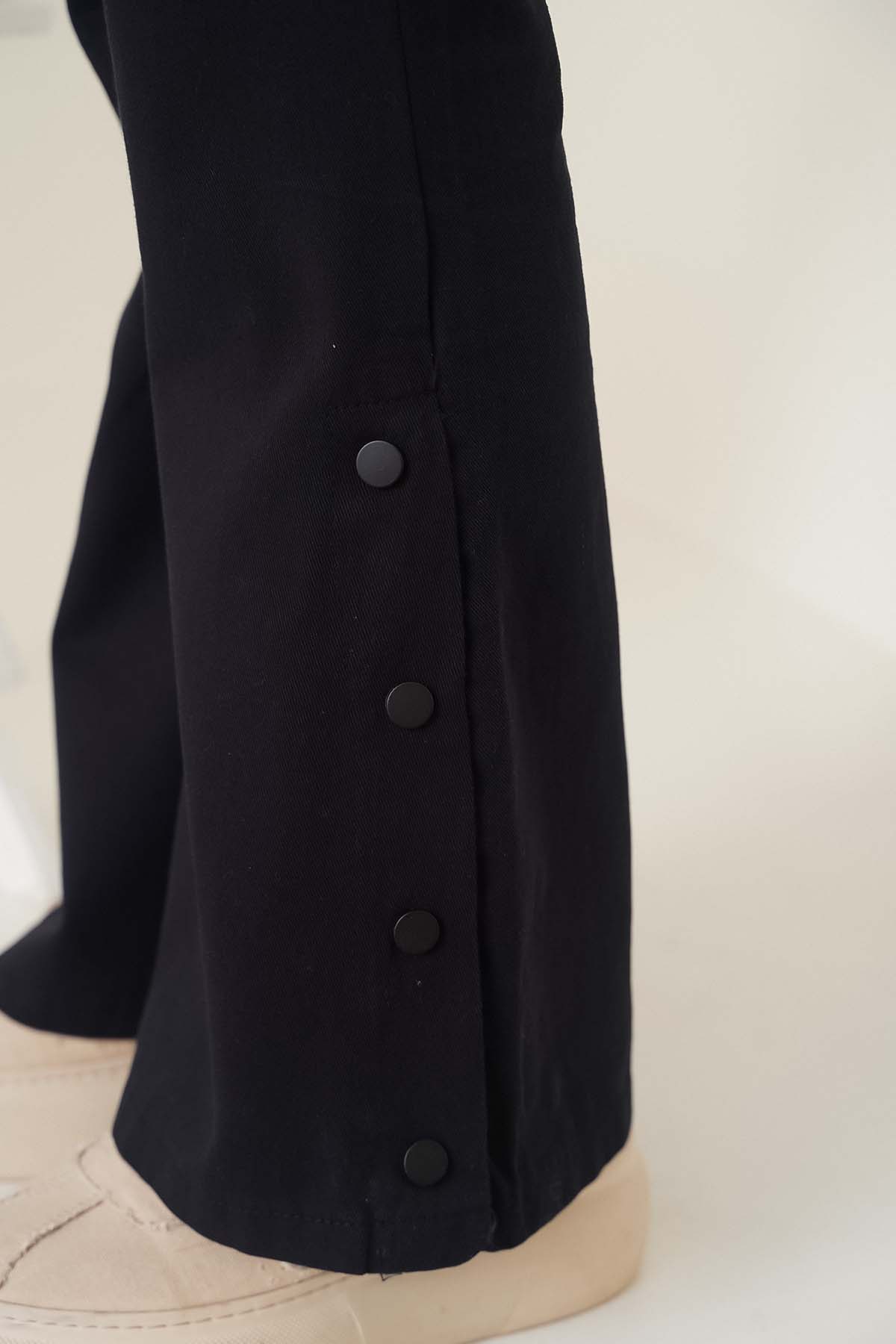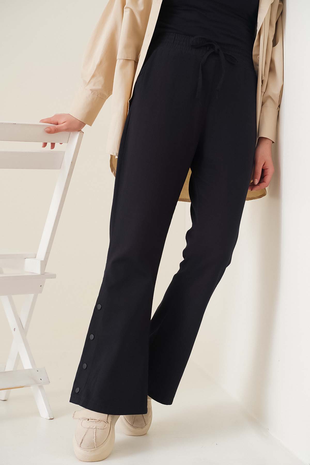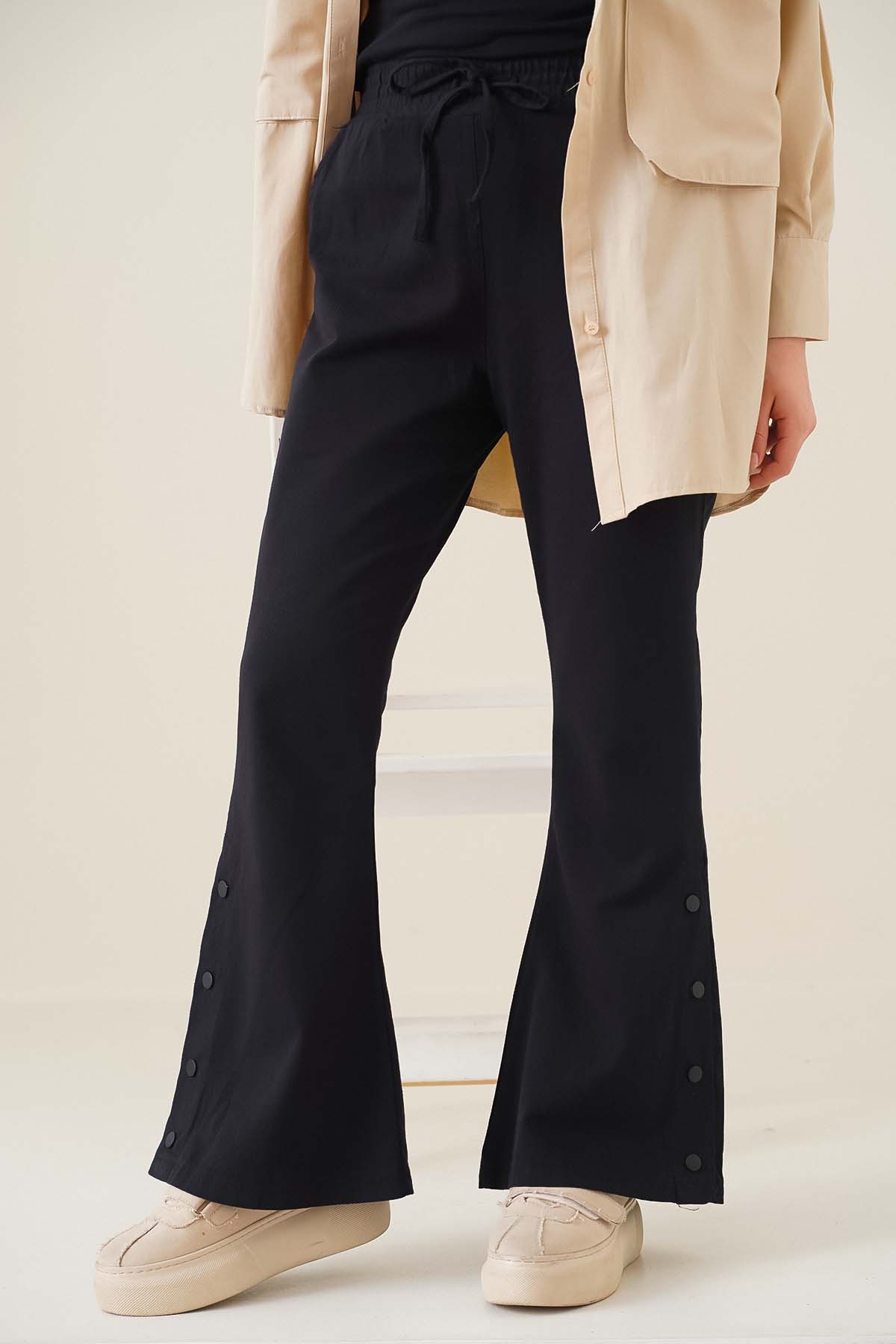 İspanyol paça modele sahip olan pantolon beli lastikli ve esnektir. Bel kısmında süs bağcık detayı bulunmaktadır . Paça kısımlarında çıt çıt düğme detayları olup aktif kullanılan iki adet cebi mevcuttur.