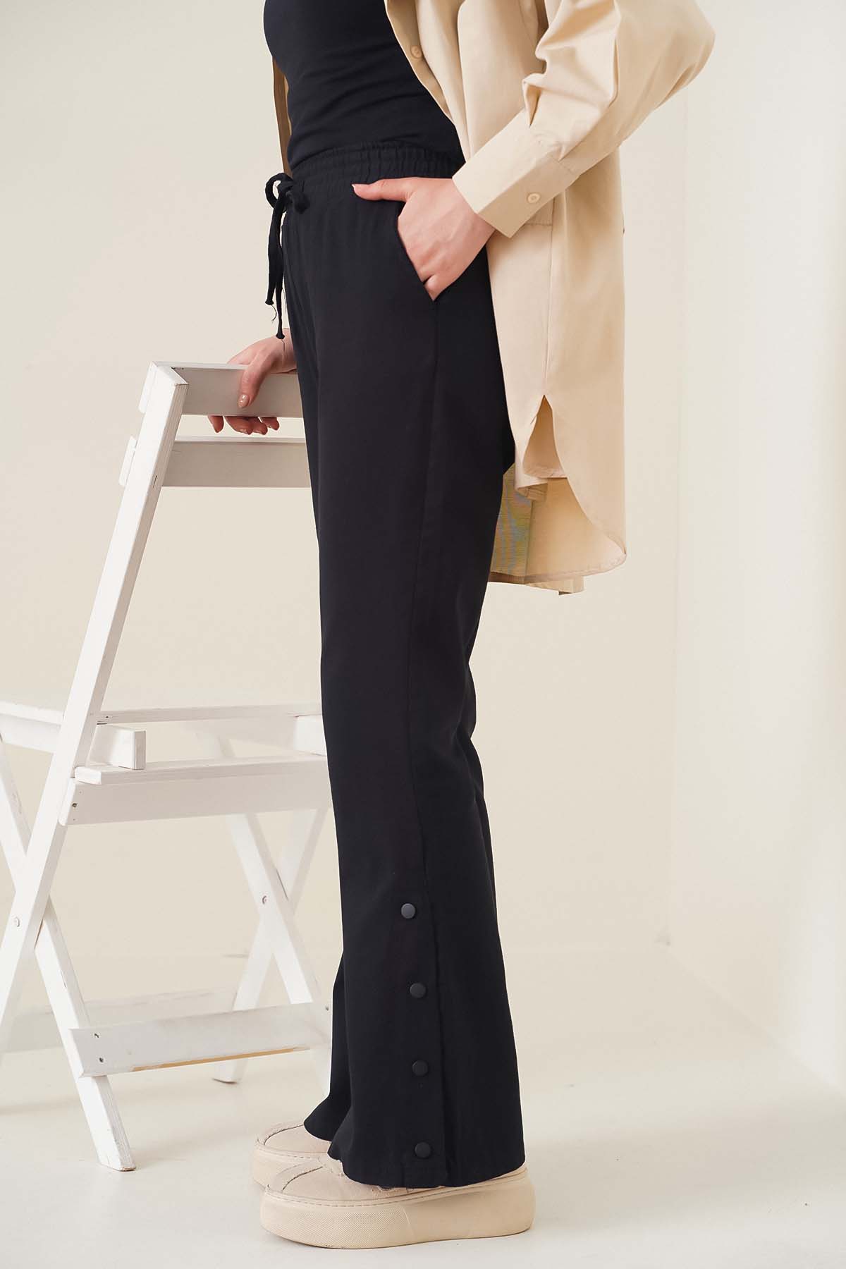 Paça: 60 cmİspanyol paça modele sahip olan pantolon beli lastikli ve esnektir. Bel kısmında süs bağcık detayı bulunmaktadır . Paça kısımlarında çıt çıt düğme detayları olup aktif kullanılan iki adet cebi mevcuttur.Kumaş Bilgisi%95 Cotton%5 ElastanModel BilgisiBoy: 164 cmGöğüs: 85 cmBel: 70 cmKalça: 90 cmModelin üzerindeki ürün - 36 - bedendir.