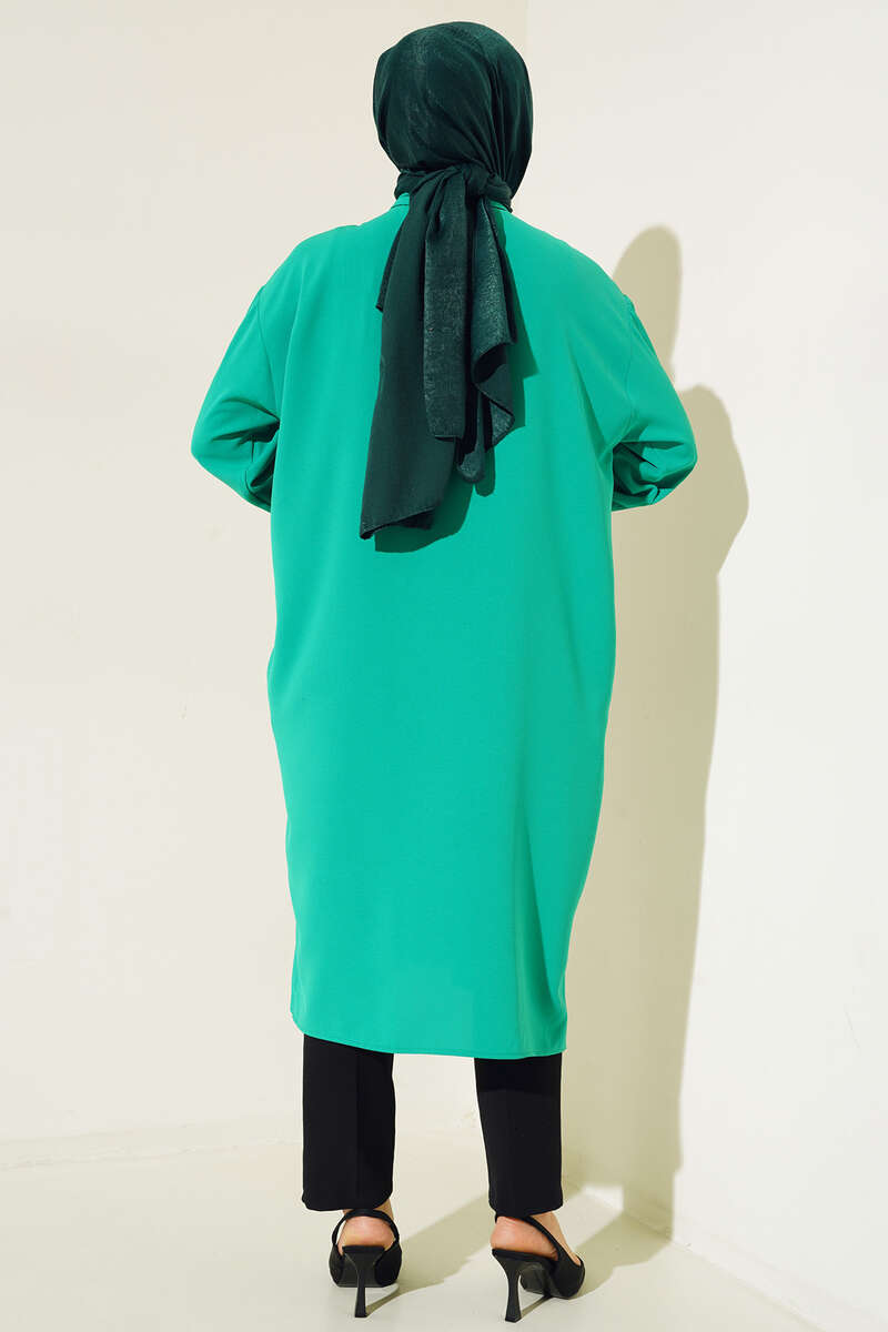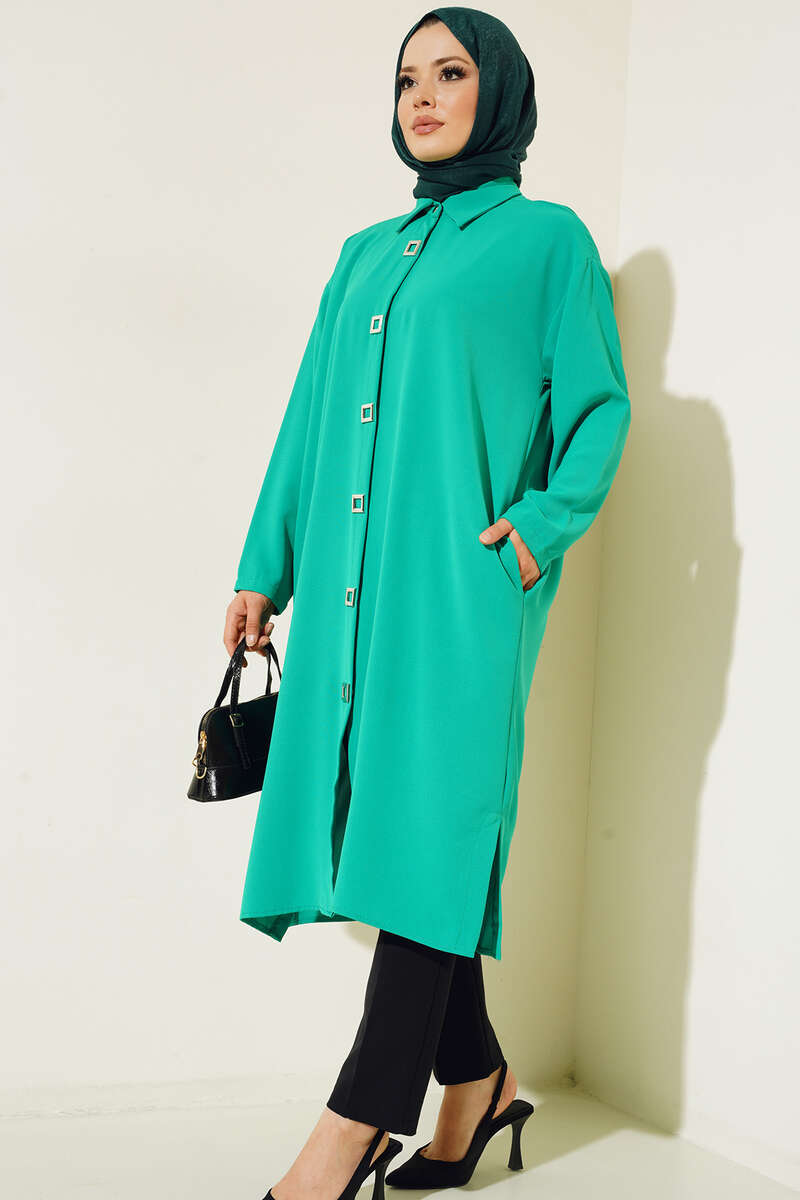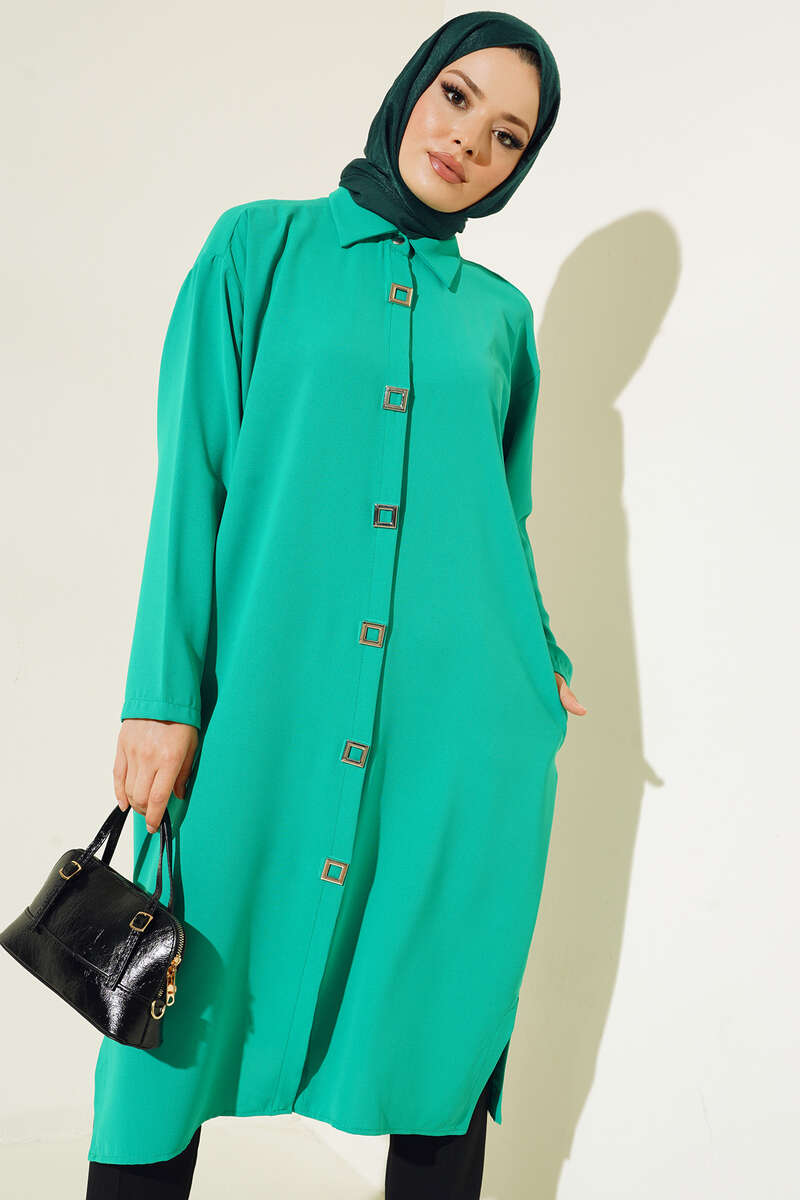 Yeni sezon uzun tuniğimiz boydan çıtçıt düğmelidir. Klasik yaka olan tuniğimiz düşük omuz modeldir. Etek uçları yanlarından yırtmaçlıdır. İki adet gizli cebi kullanılabilmektedir.