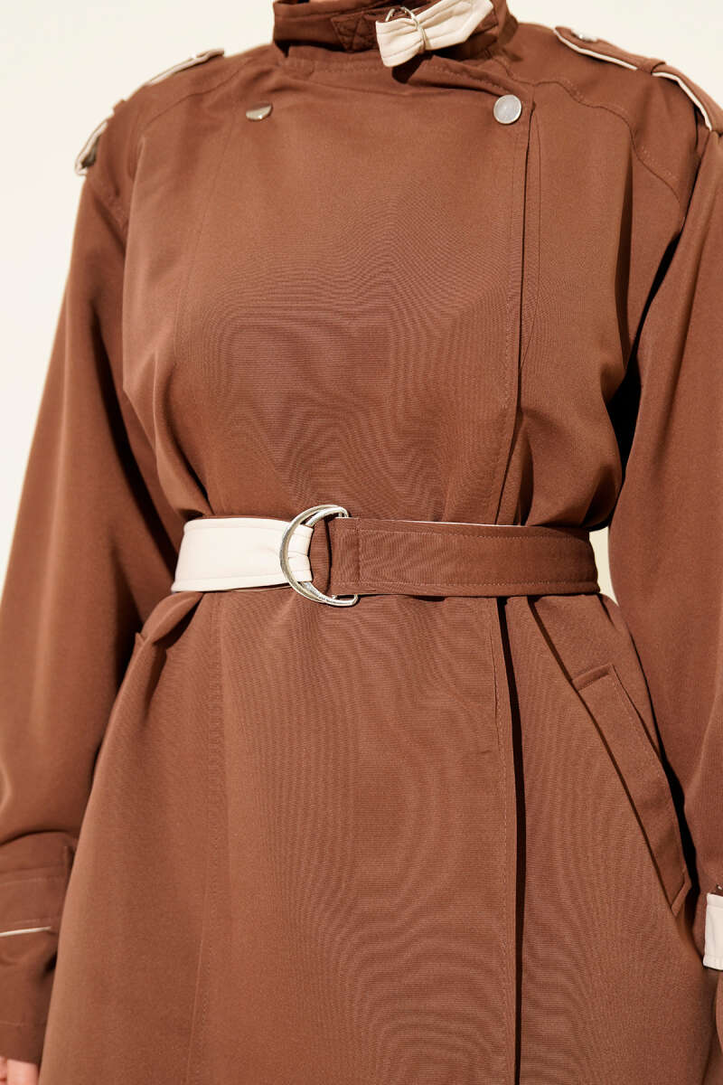 Çıtçıt Düğmeli Deri Detaylı Trençkot Taba