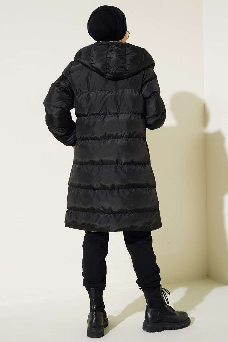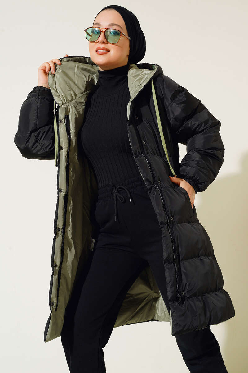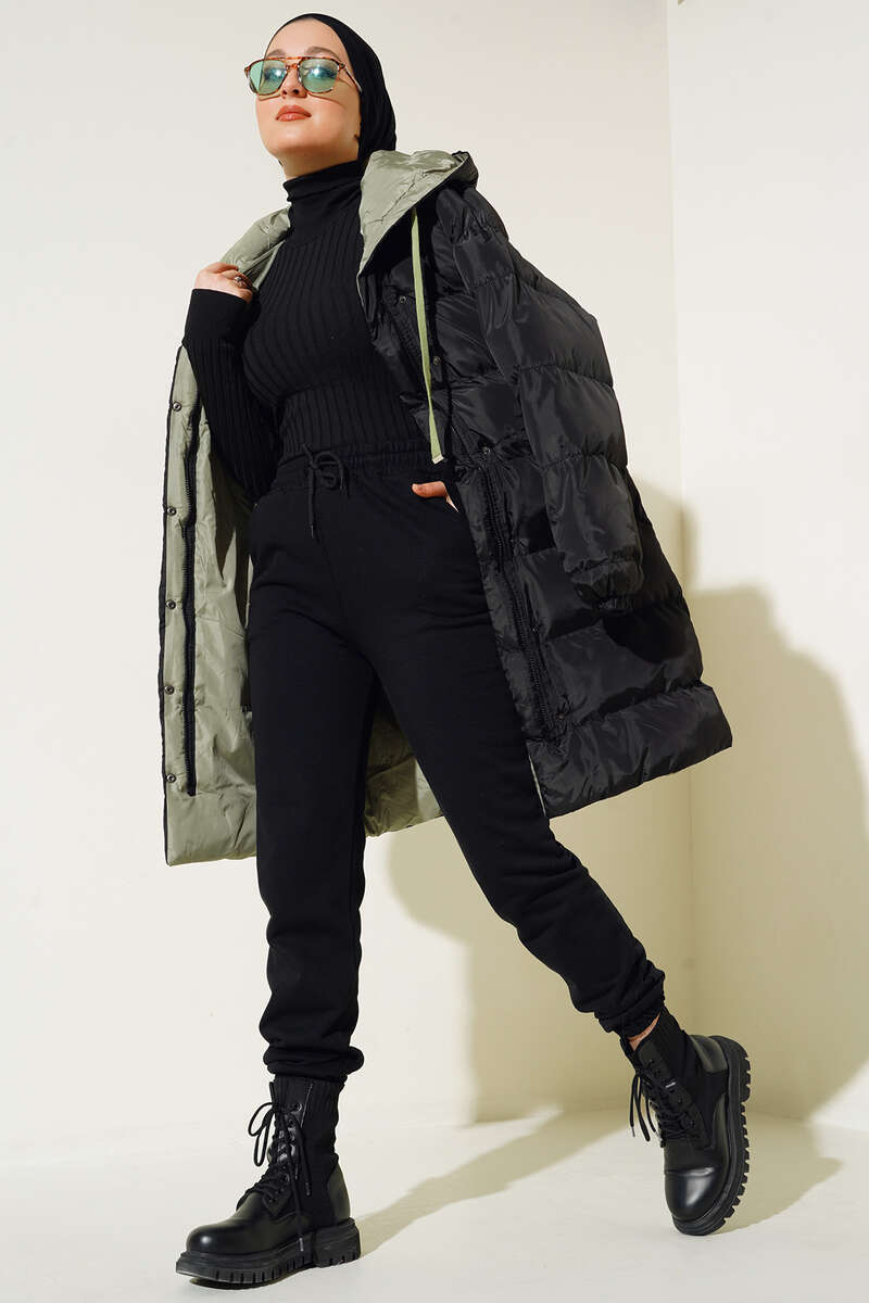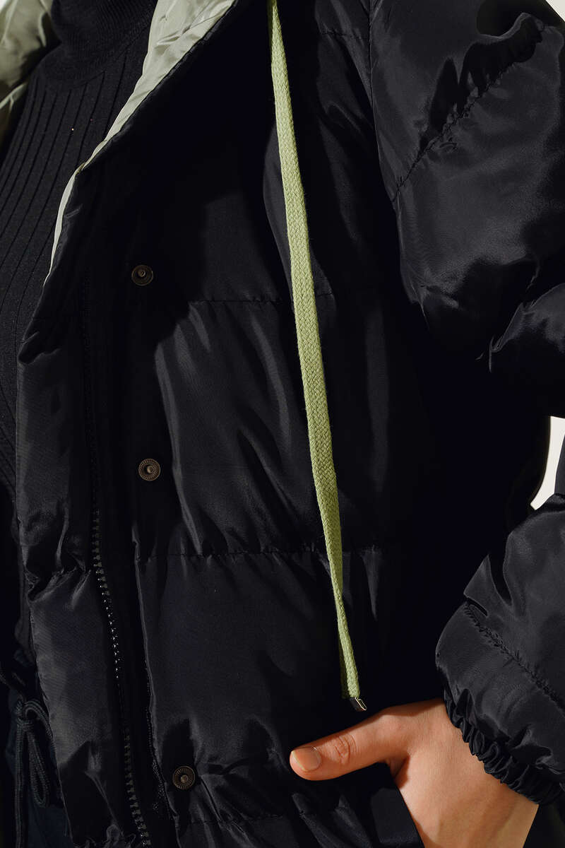 Yeni sezon şişme montumuz soğuk havalarda şıklığınızın tamamlayıcı parçası olacaktır. Boydan fermuarlı mont çıtçıt düğmelidir. Montumuz kapüşonludur. Kapüşonu ip bağlamalıdır. Ön tarafta bulunan cepleri kullanışlıdır.