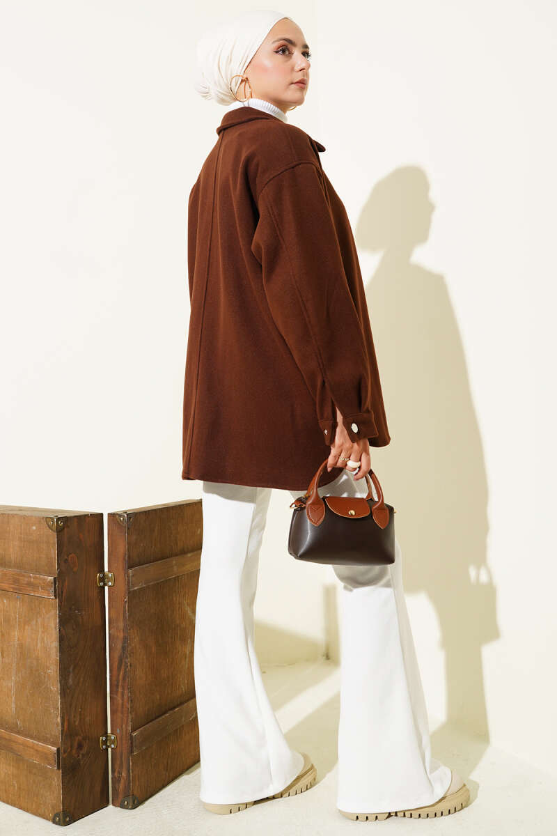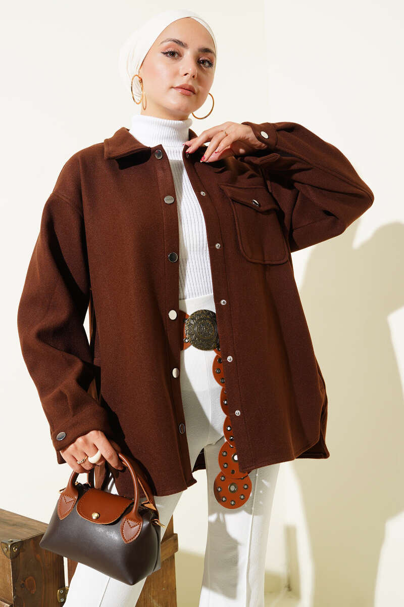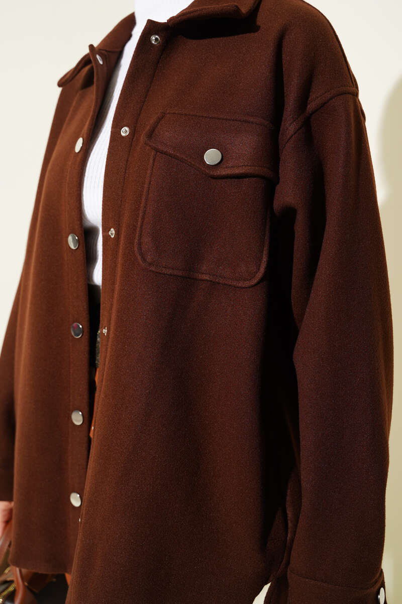 Çıtçıt Düğmeli Gömlek Yaka Kaşe Ceket Kahve