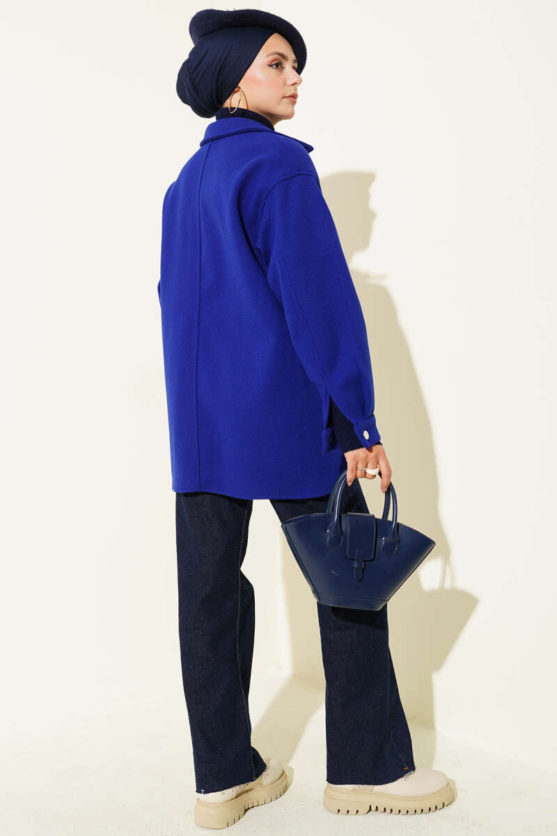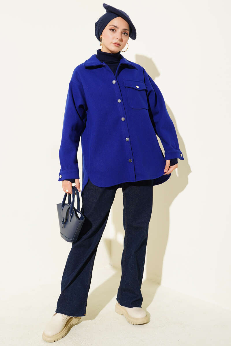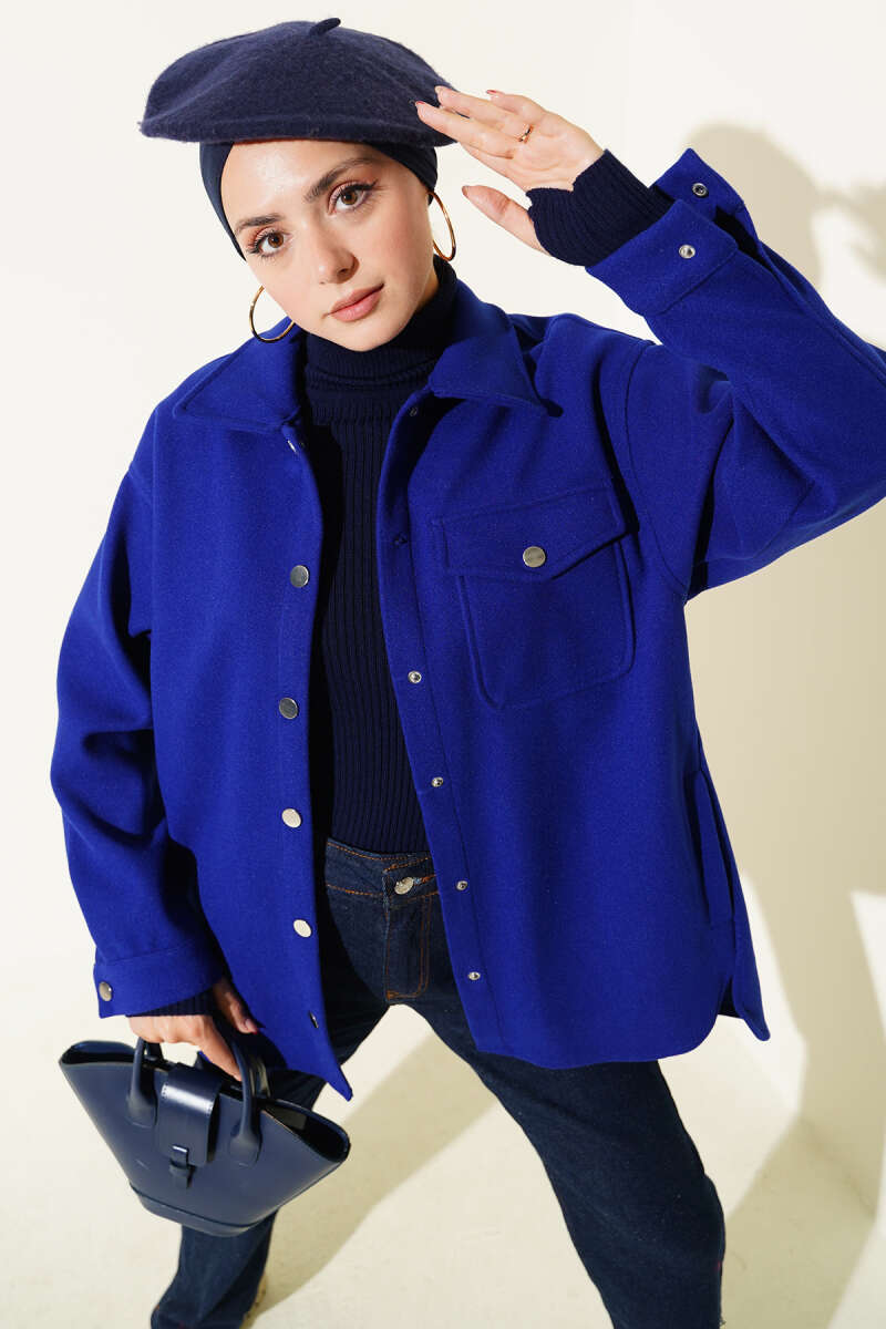 Çıtçıt Düğmeli Gömlek Yaka Kaşe Ceket Saks