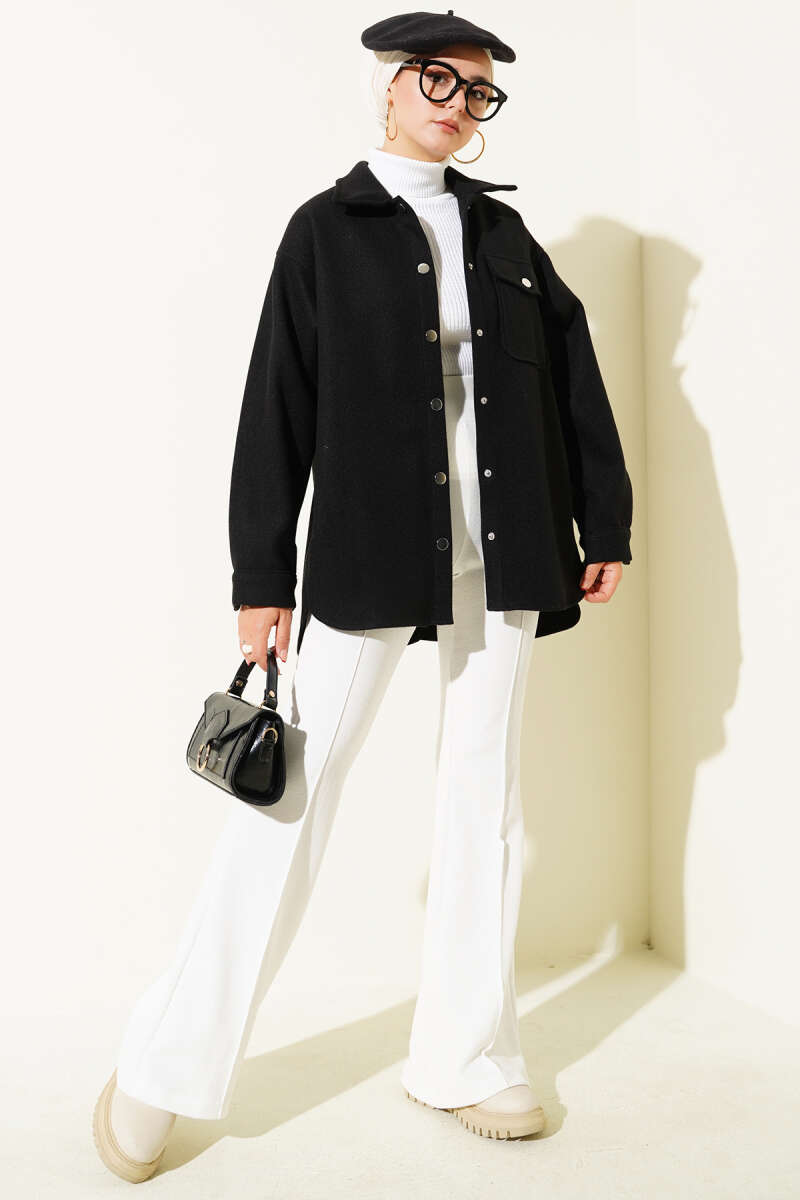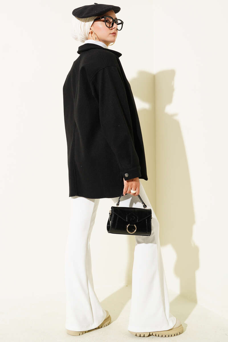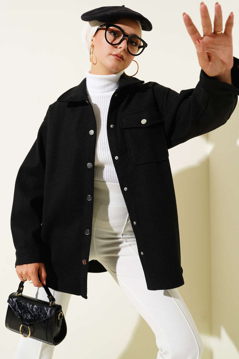 Çıtçıt Düğmeli Gömlek Yaka Kaşe Ceket Siyah