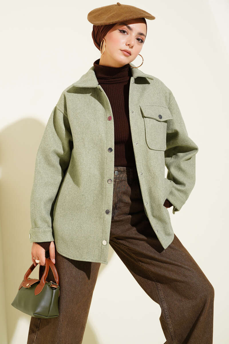 Çıtçıt Düğmeli Gömlek Yaka Kaşe Ceket Su Yeşili