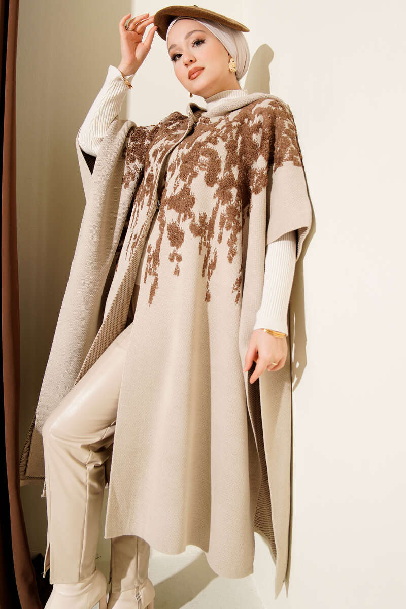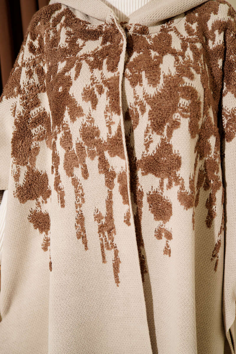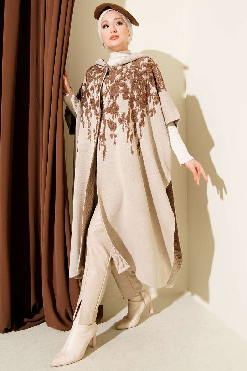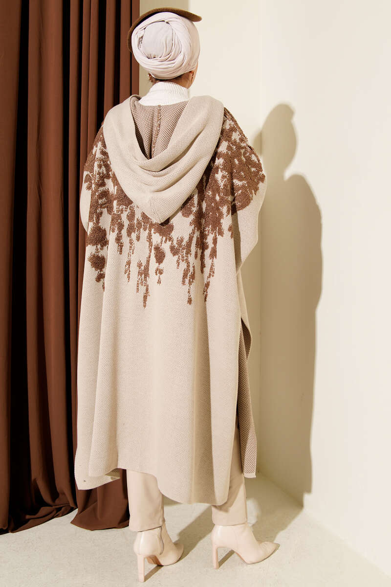 Kabartma Desen Püsküllü Kapüşonlu Panço Füme