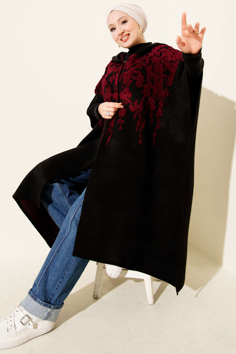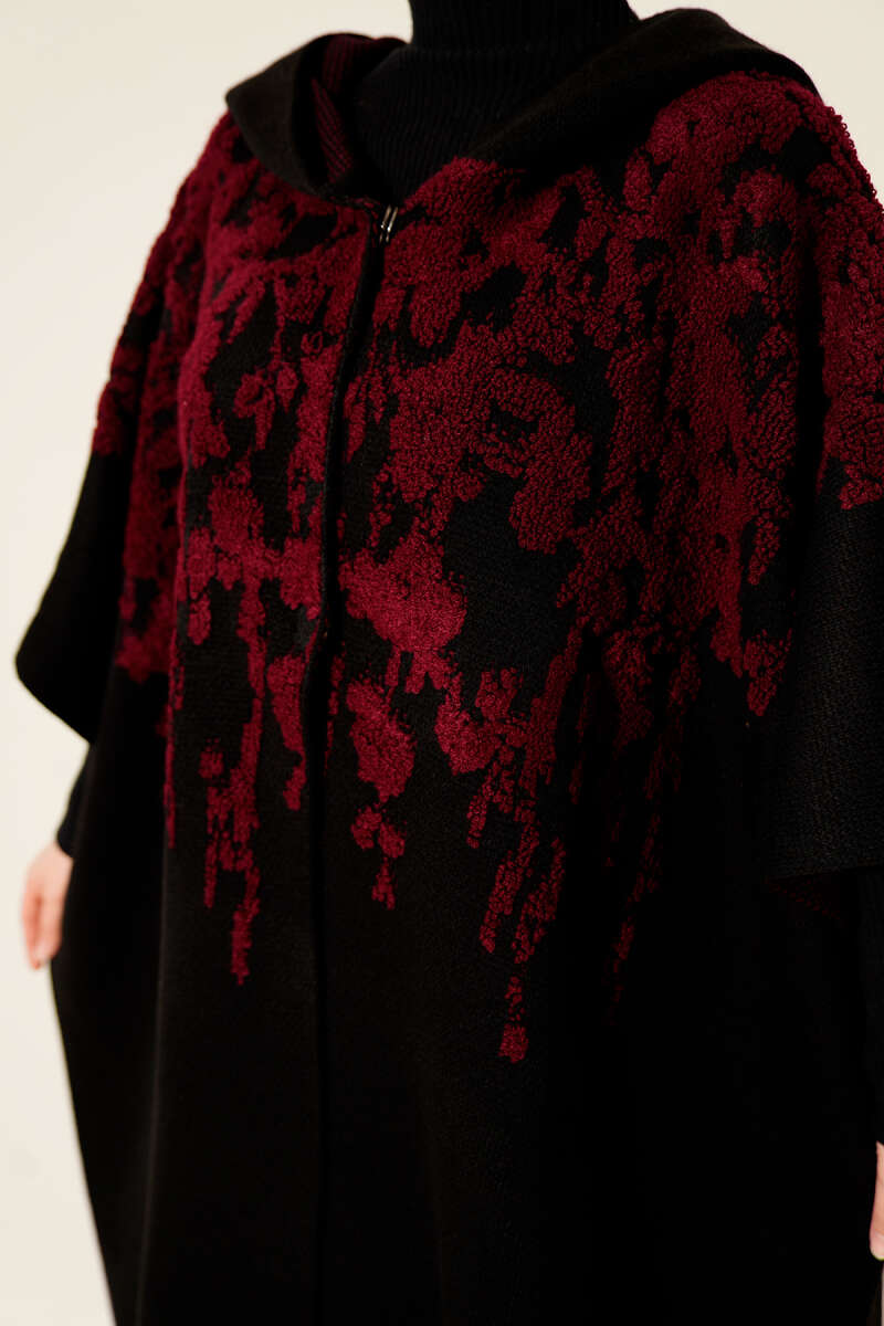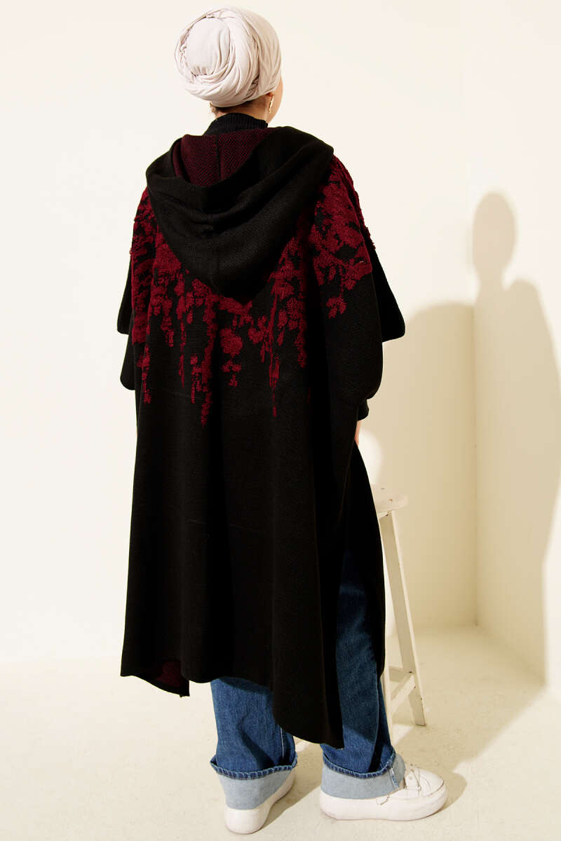 Kazayağı Desen Kapüşonlu Panço Siyah