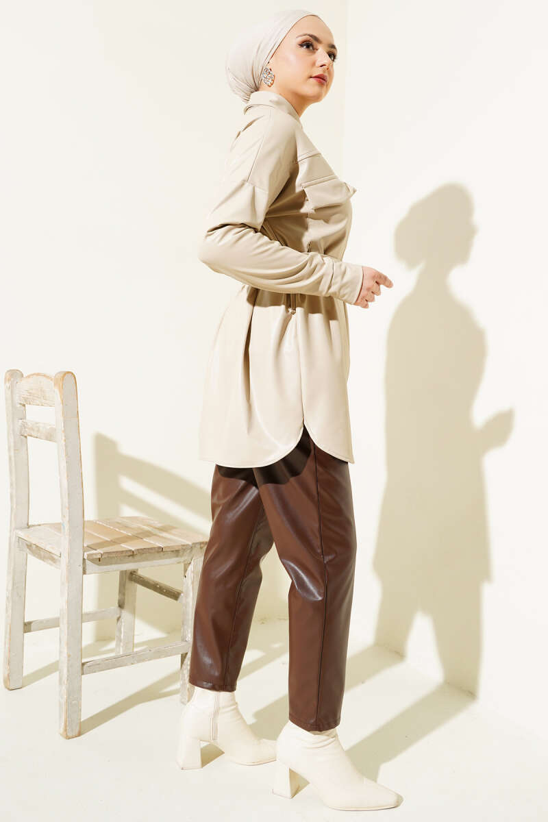 Çıtçıt Düğmeli Kuşaklı Deri Gömlek Bej