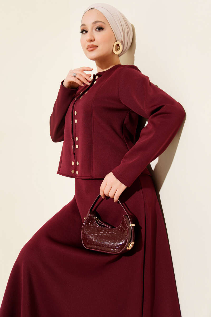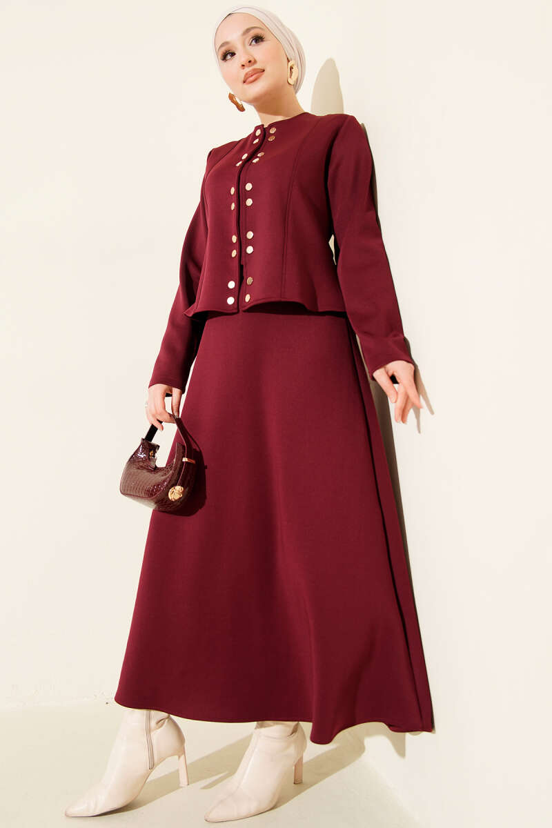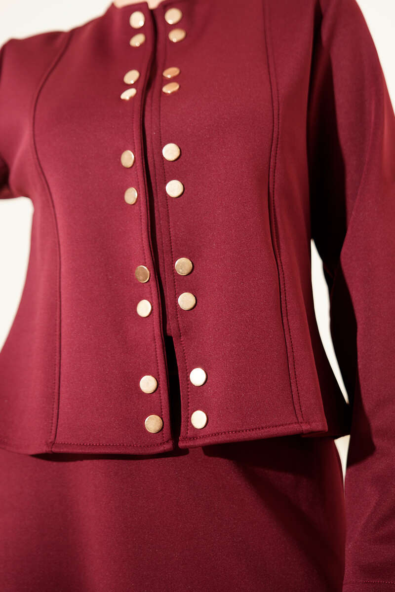 Gold Düğmeli Yelekli Elbise Takım Bordo