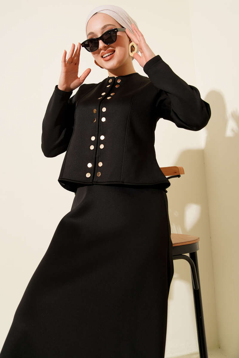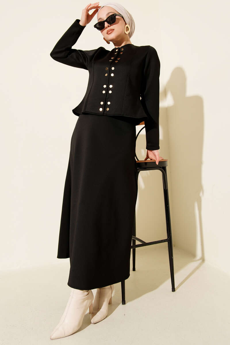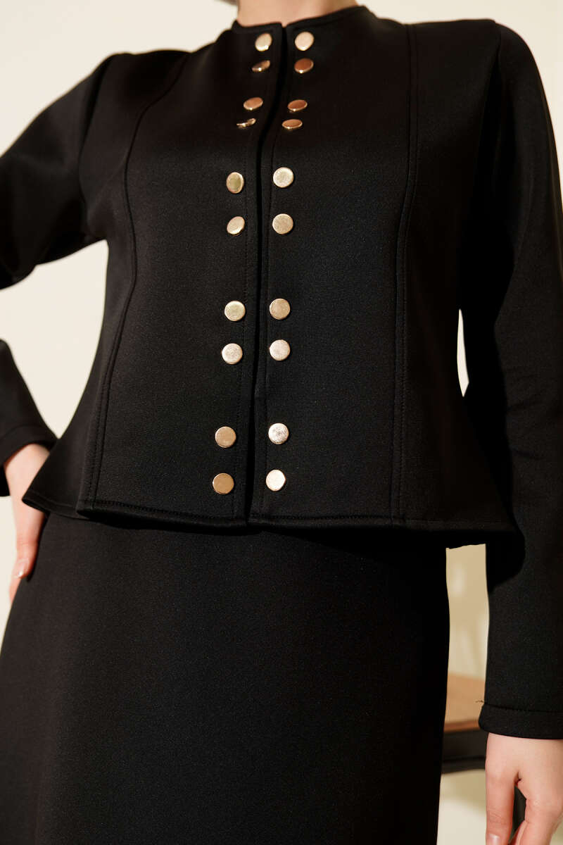 Gold Düğmeli Yelekli Elbise Takım Siyah