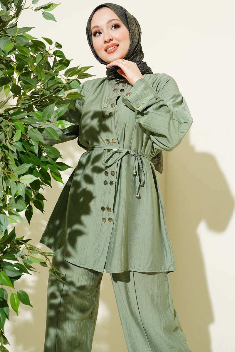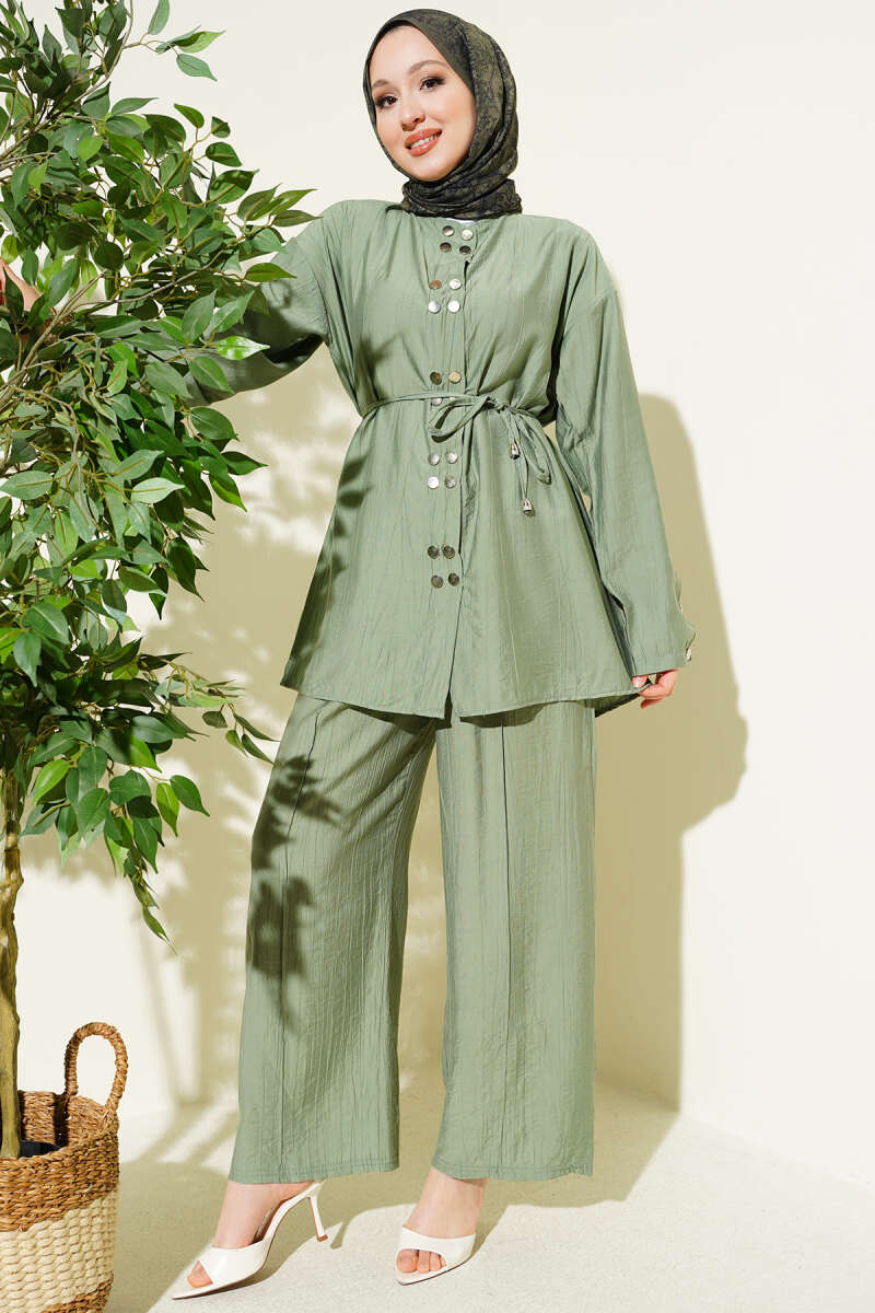 Üzerindeki metalik çıtçıt detaylarıyla modern ve stil sahibi bir görünüm sunan bu ikili takım, dökümlü kumaş yapısıyla gün boyu konforlu bir kullanım vaat eder. Bel kısmındaki ince ip kuşak detayı silüetinizi zarifçe vurgularken, geniş paça pantolon tasarımı hareket özgürlüğünüzü destekleyerek asil bir duruş sergiler. Tunik formundaki üst parçanın boydan çıtçıtlı yapısı ve dikey dikiş detayları, takıma hem fonksiyonellik hem de boyu daha uzun gösteren estetik bir derinlik katar. Kaliteli dokusu ve zamansız tasarımıyla hem günlük şıklıkta hem de özel buluşmalarda çabasız zarafeti yakalamak isteyenler için ideal bir tercihtir.
