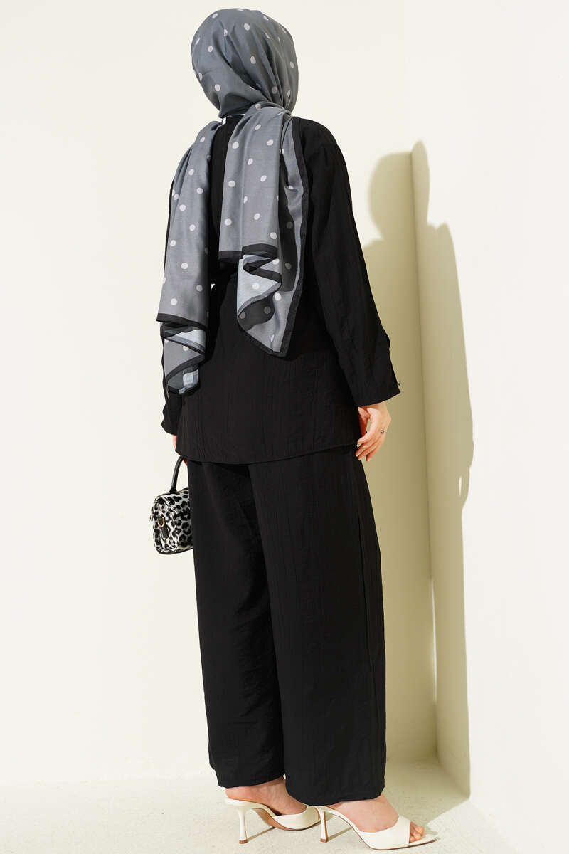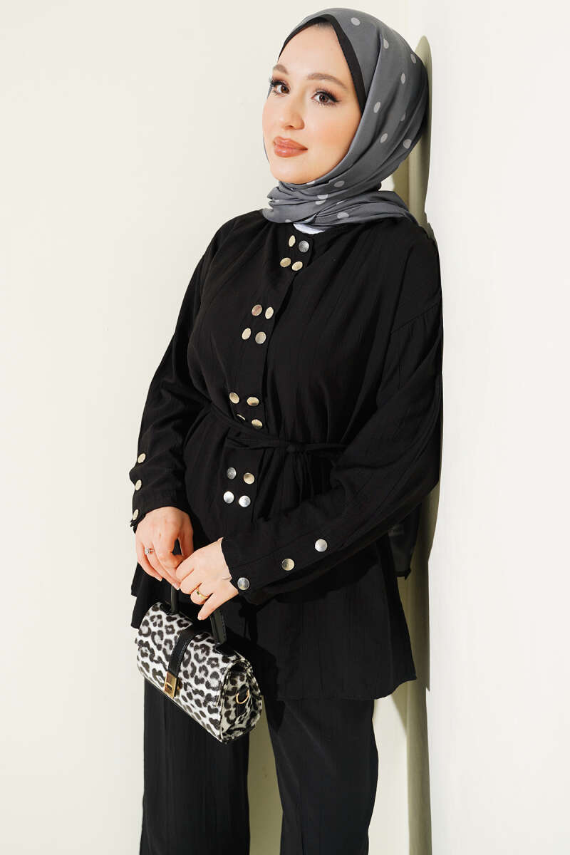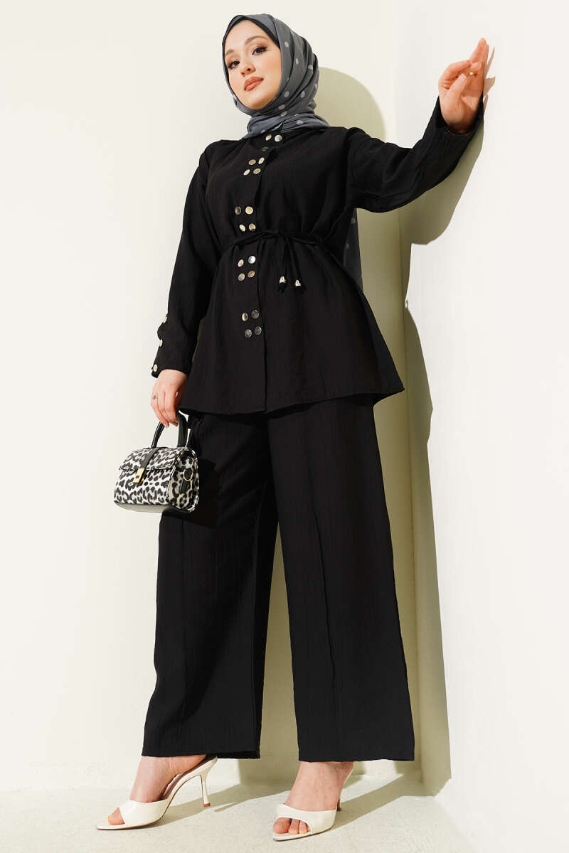 Üzerindeki metalik çıtçıt detaylarıyla modern ve stil sahibi bir görünüm sunan bu ikili takım, dökümlü kumaş yapısıyla gün boyu konforlu bir kullanım vaat eder. Bel kısmındaki ince ip kuşak detayı silüetinizi zarifçe vurgularken, geniş paça pantolon tasarımı hareket özgürlüğünüzü destekleyerek asil bir duruş sergiler. Tunik formundaki üst parçanın boydan çıtçıtlı yapısı ve dikey dikiş detayları, takıma hem fonksiyonellik hem de boyu daha uzun gösteren estetik bir derinlik katar. Kaliteli dokusu ve zamansız tasarımıyla hem günlük şıklıkta hem de özel buluşmalarda çabasız zarafeti yakalamak isteyenler için ideal bir tercihtir.