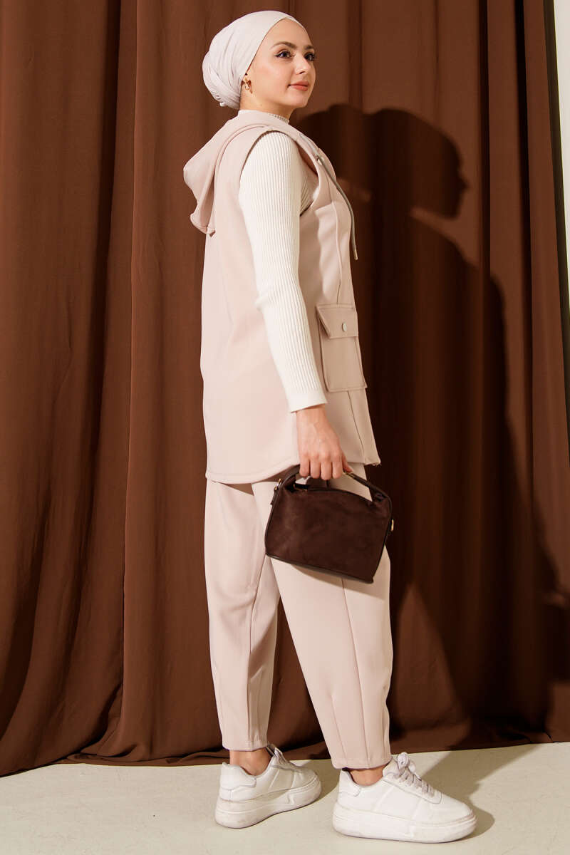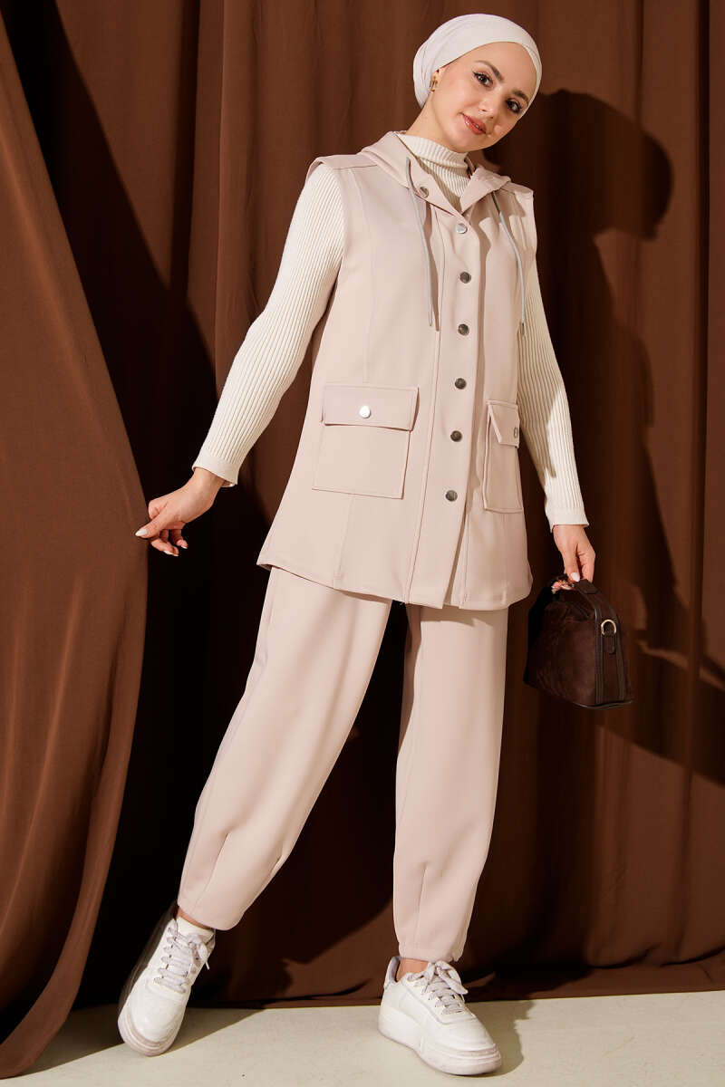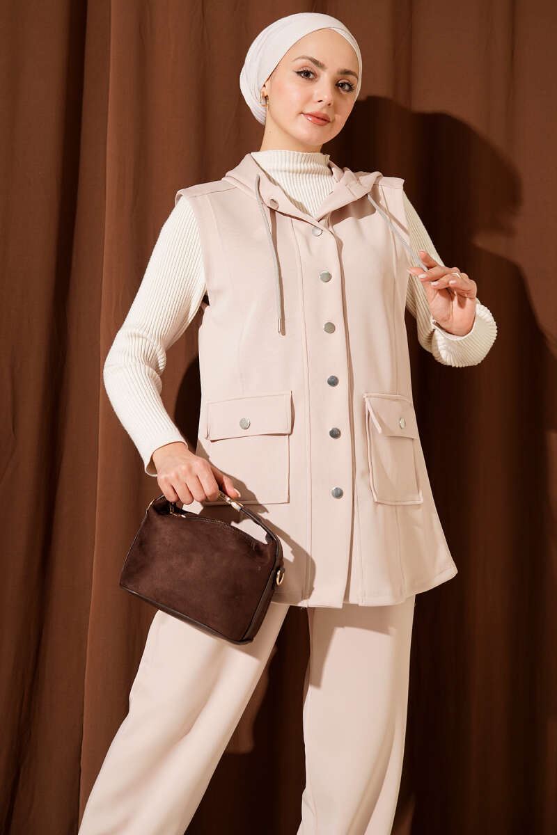 Çıtçıtlı Kapüşonlu Scuba Yelek Takım Latte