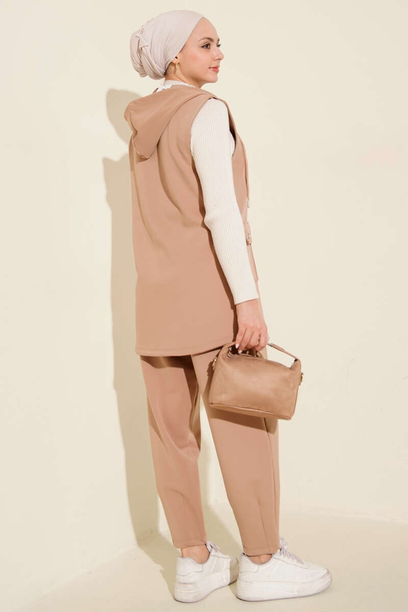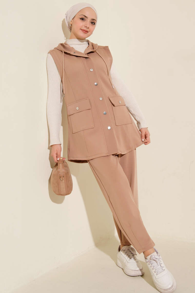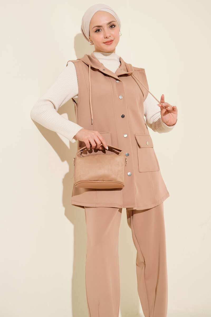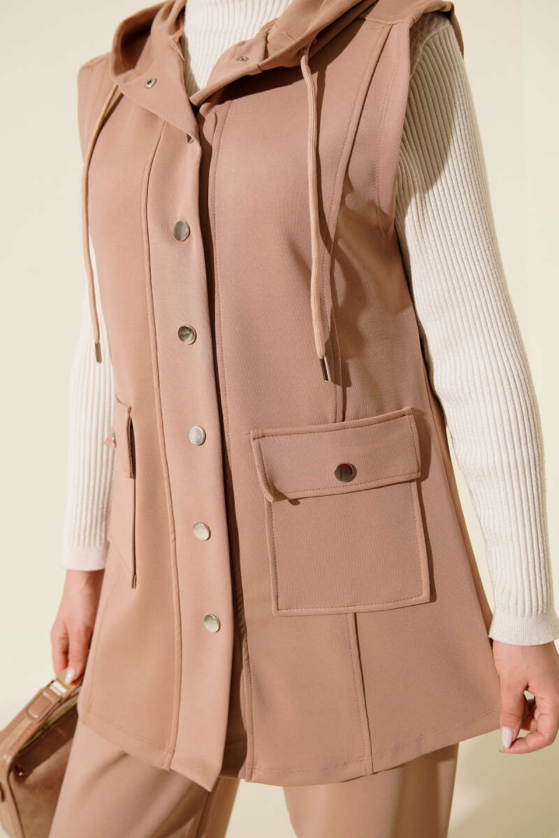Çıtçıtlı Kapüşonlu Scuba Yelek Takım Latte