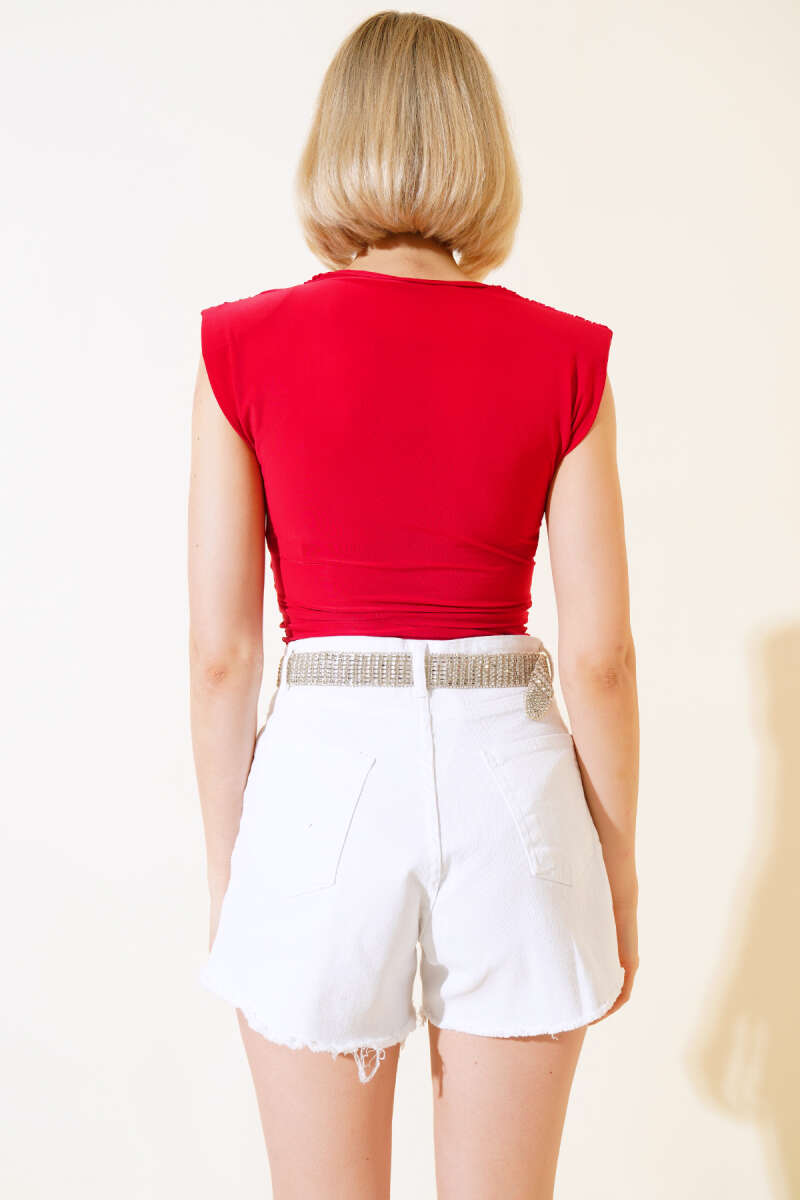 Göğsü Büzgülü Askılı Mini Elbise Bordo