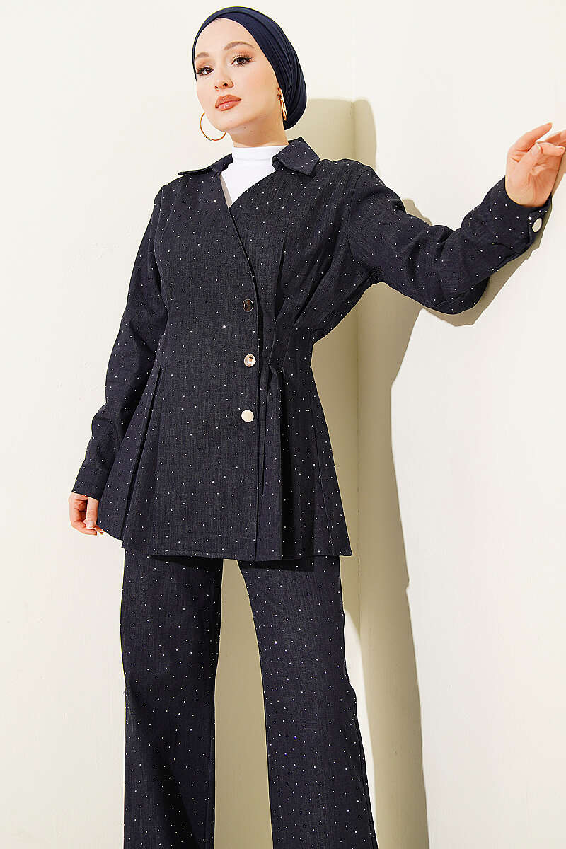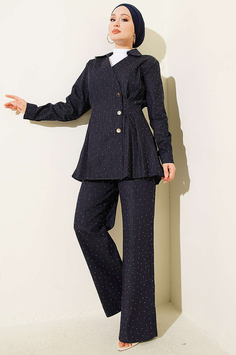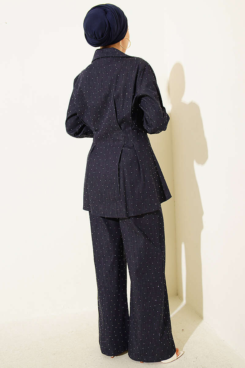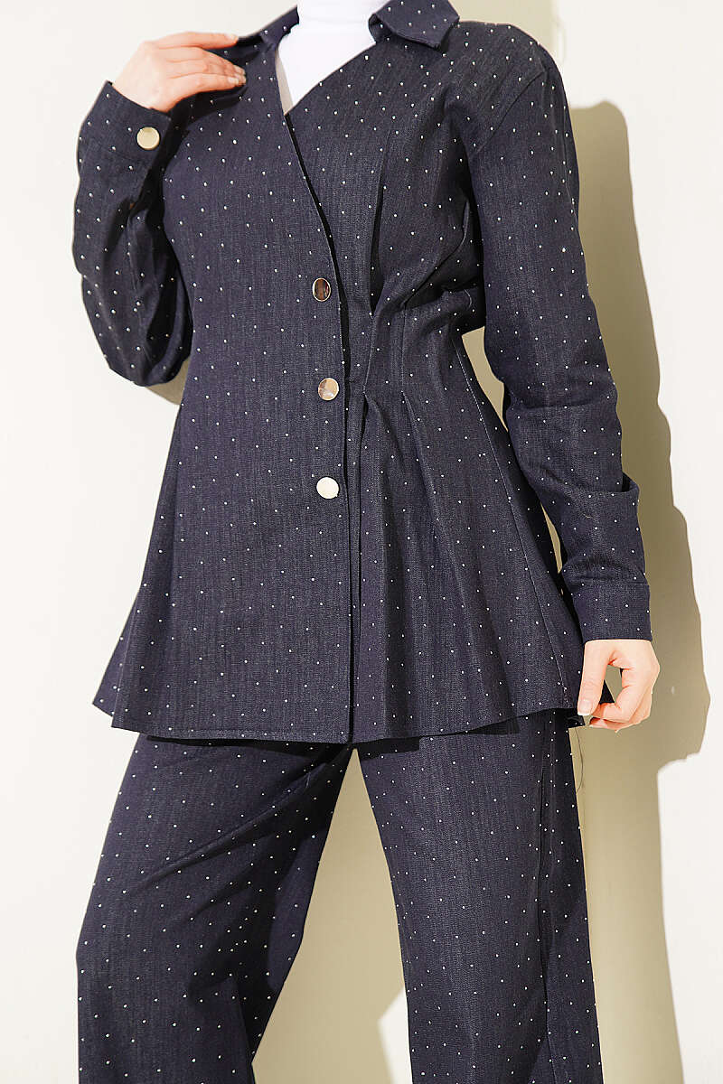 Çıtçıtlı Mini Taşlı Kot İkili Takım Lacivert