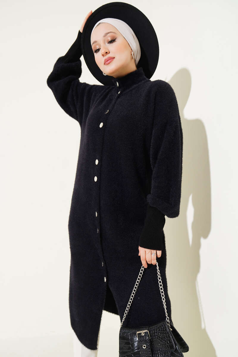 Fularlı Düğmeli Triko Hırka Siyah