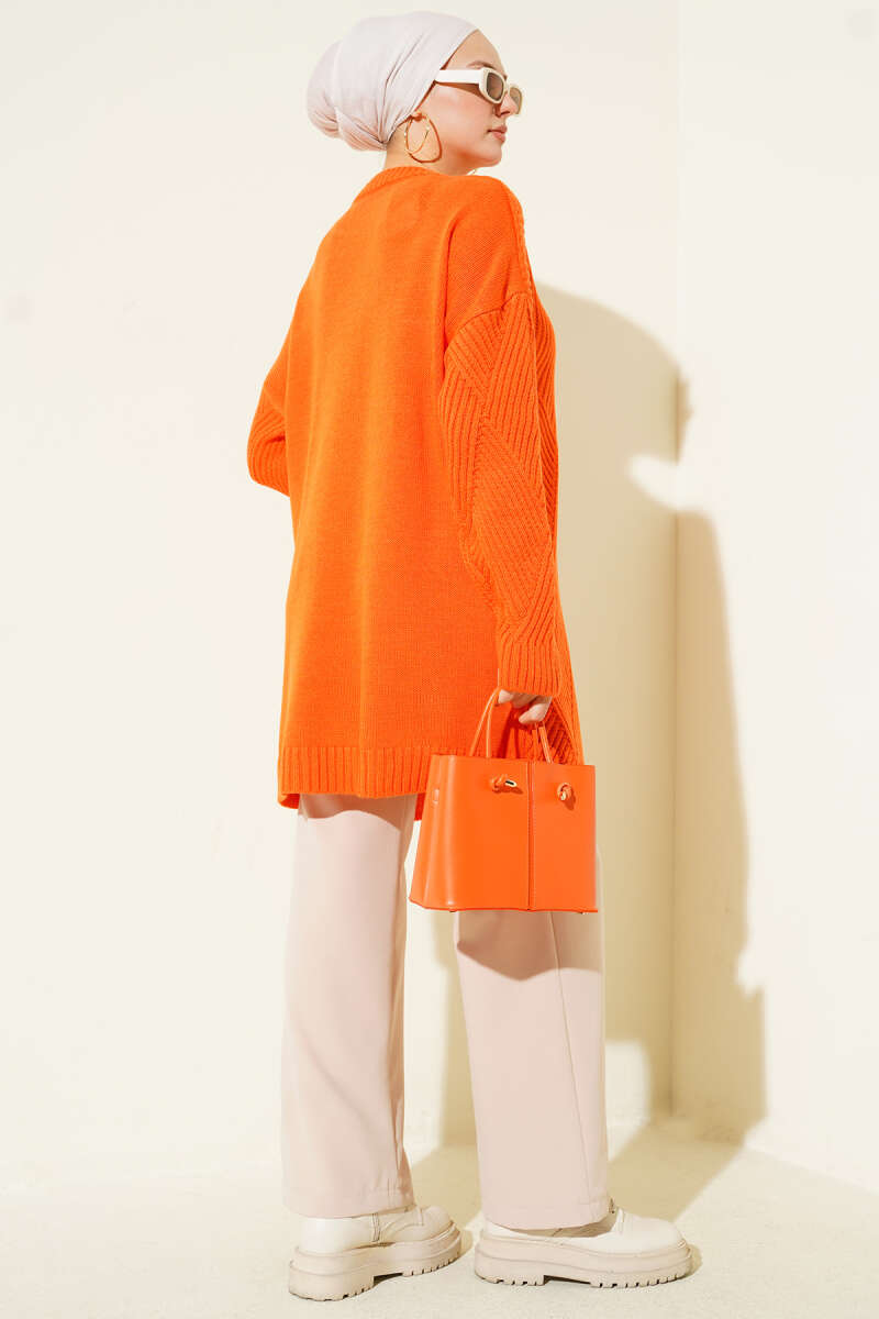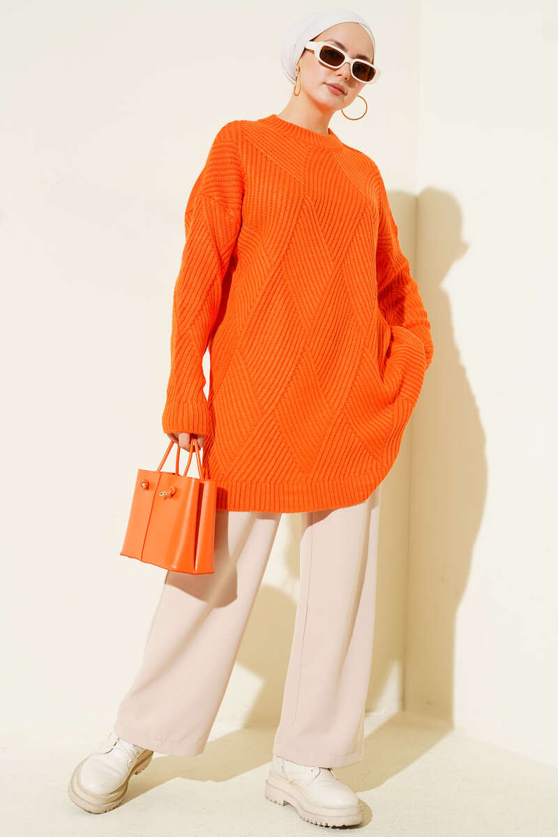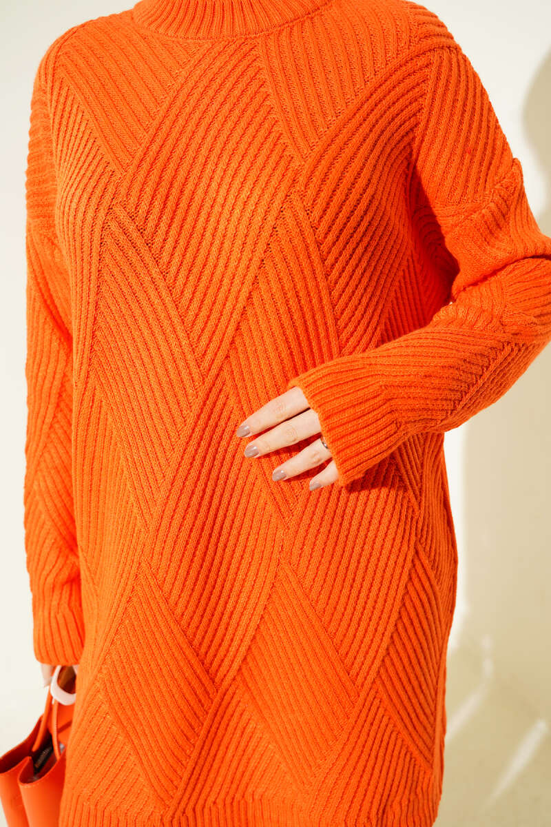 Çizgi Baklava Desen Triko Tunik Oranj