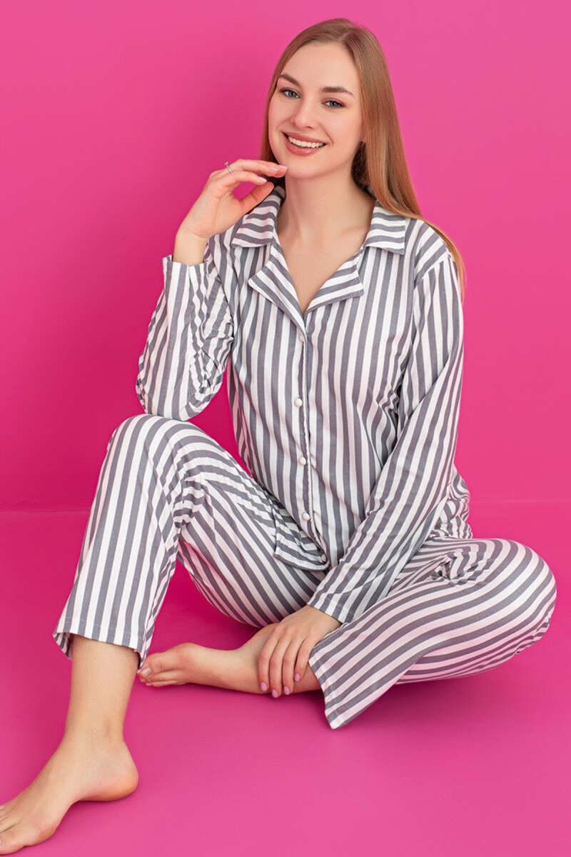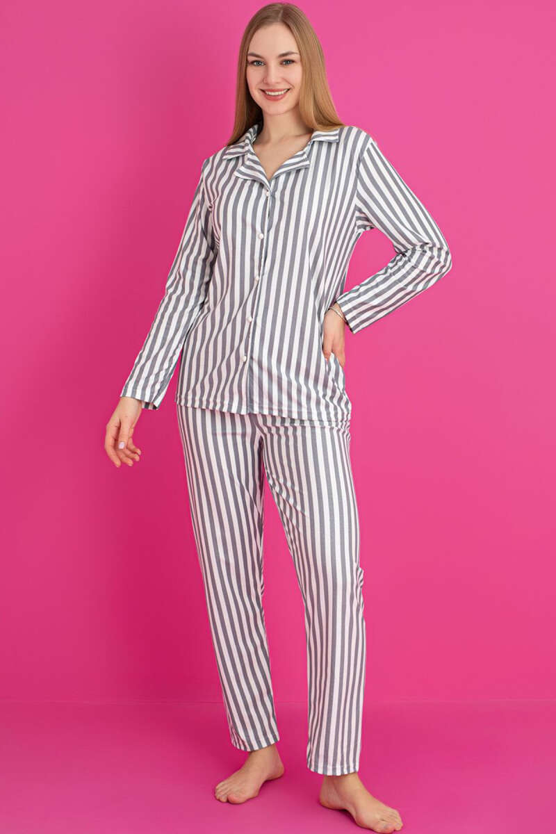 Çizgi Desen Düğmeli Süet Pijama Takım Gri