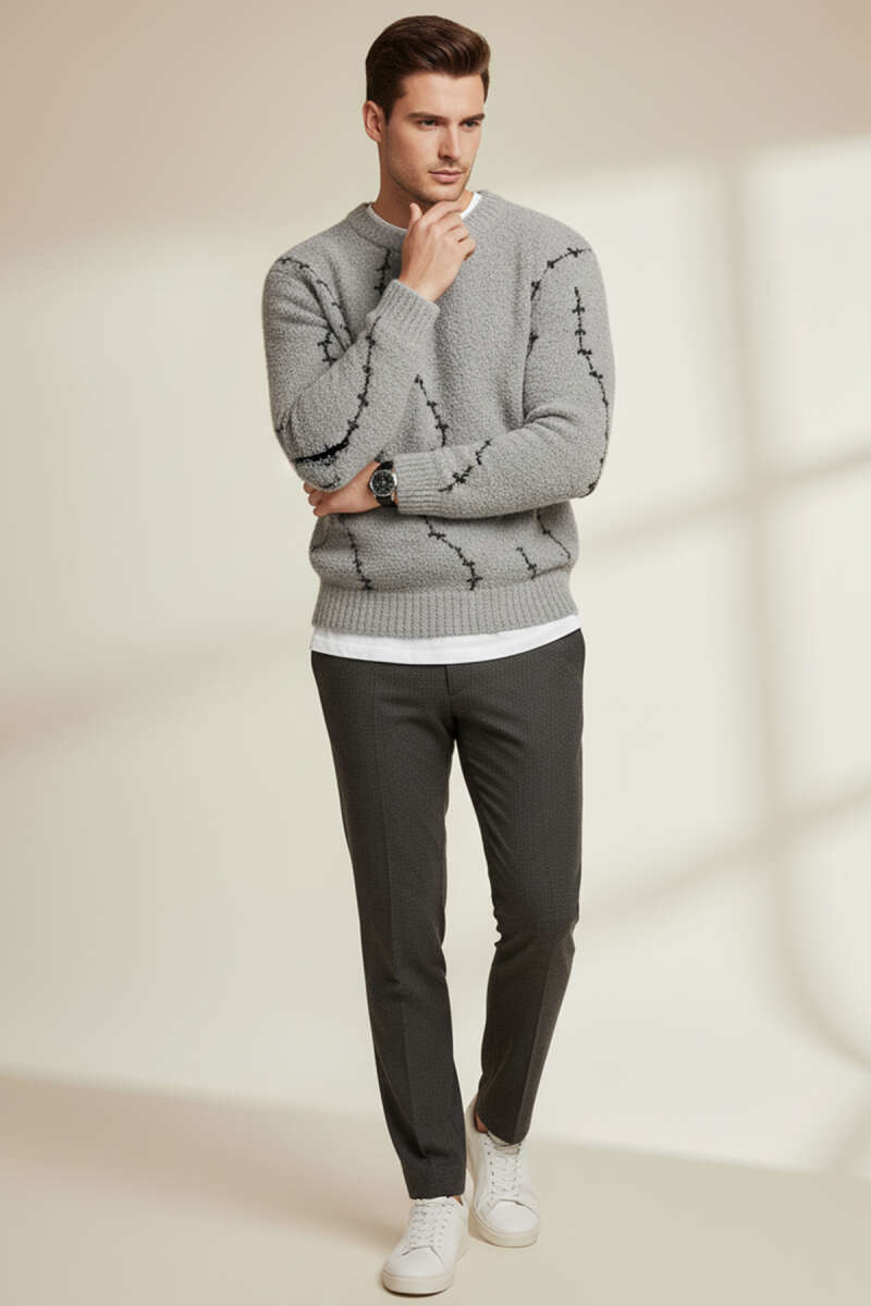 Yaka Fermuarlı Erkek Triko Kazak Gri