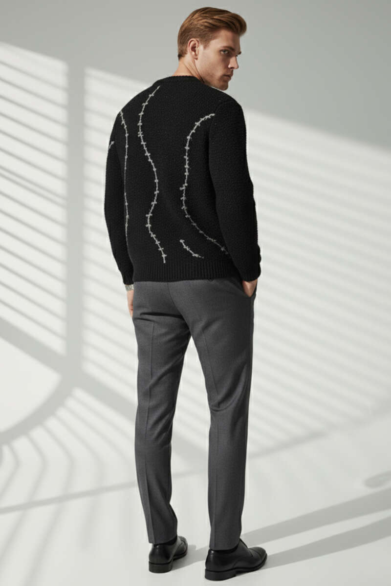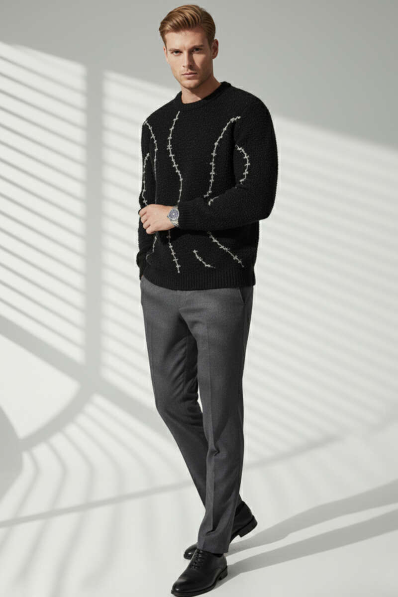 Çizgi Desen Örgü Triko Erkek Kazak Gri