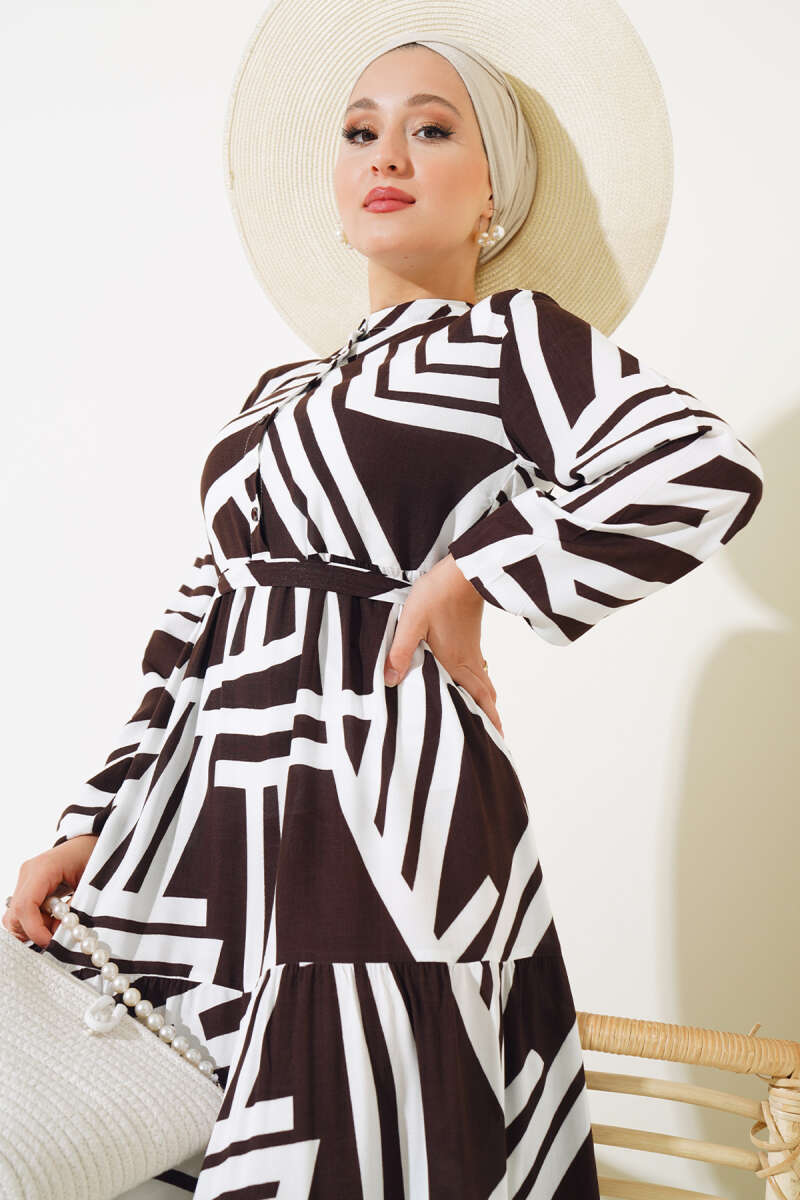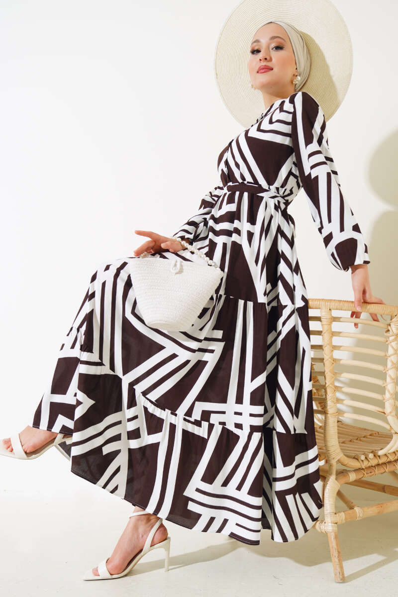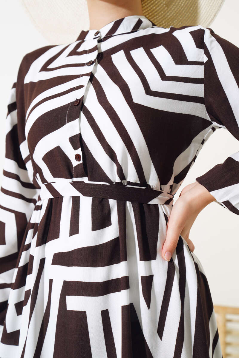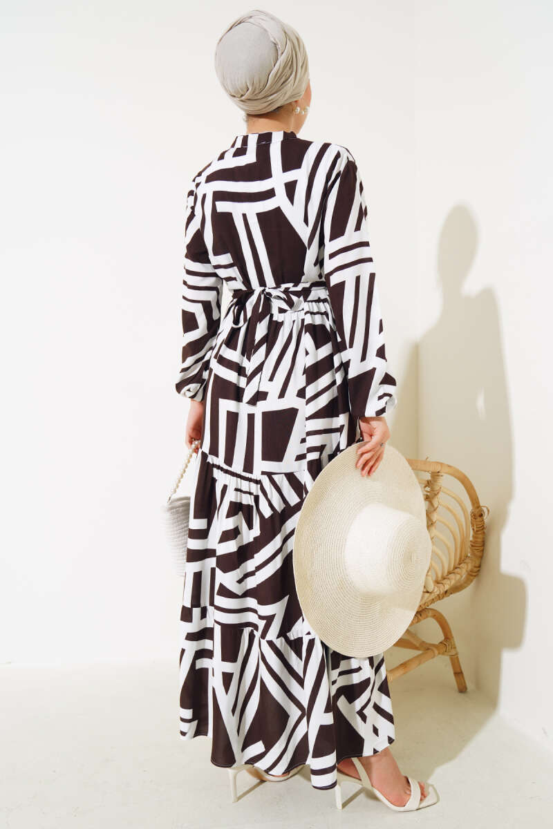 Ekose Desenli Kemerli Elbise Kahve
