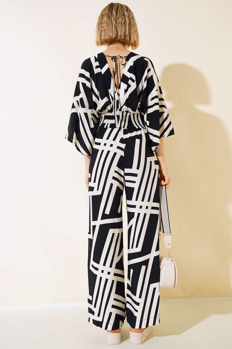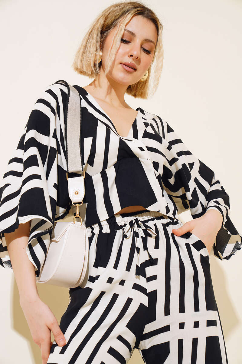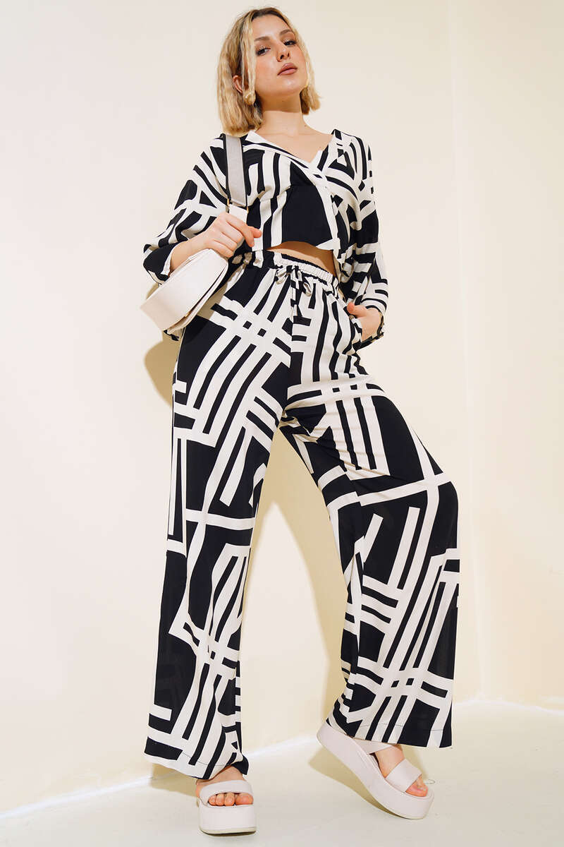 Paça: 62 cmYeni sezon ikili takımımız şık tarzıyla favoriniz olacak. Crop modelimiz sırtı ip bağlamalıdır. V yakadır. Yarasa koldur. Crop modelimizin arka bel kısmı gipelidir. Pantolonumuz bol paçadır. Beli lastiklidir. Ceplidir. Modern duruşuyla şık olan ikili takımımız tam size göre.Kumaş Bilgisi%100 PolyesterModel BilgisiBoy: 170 cmGöğüs: 86 cmBel: 64 cmKalça: 93 cm