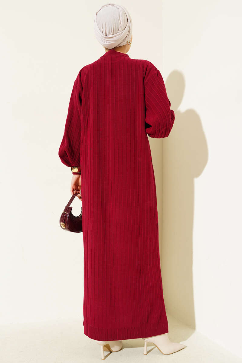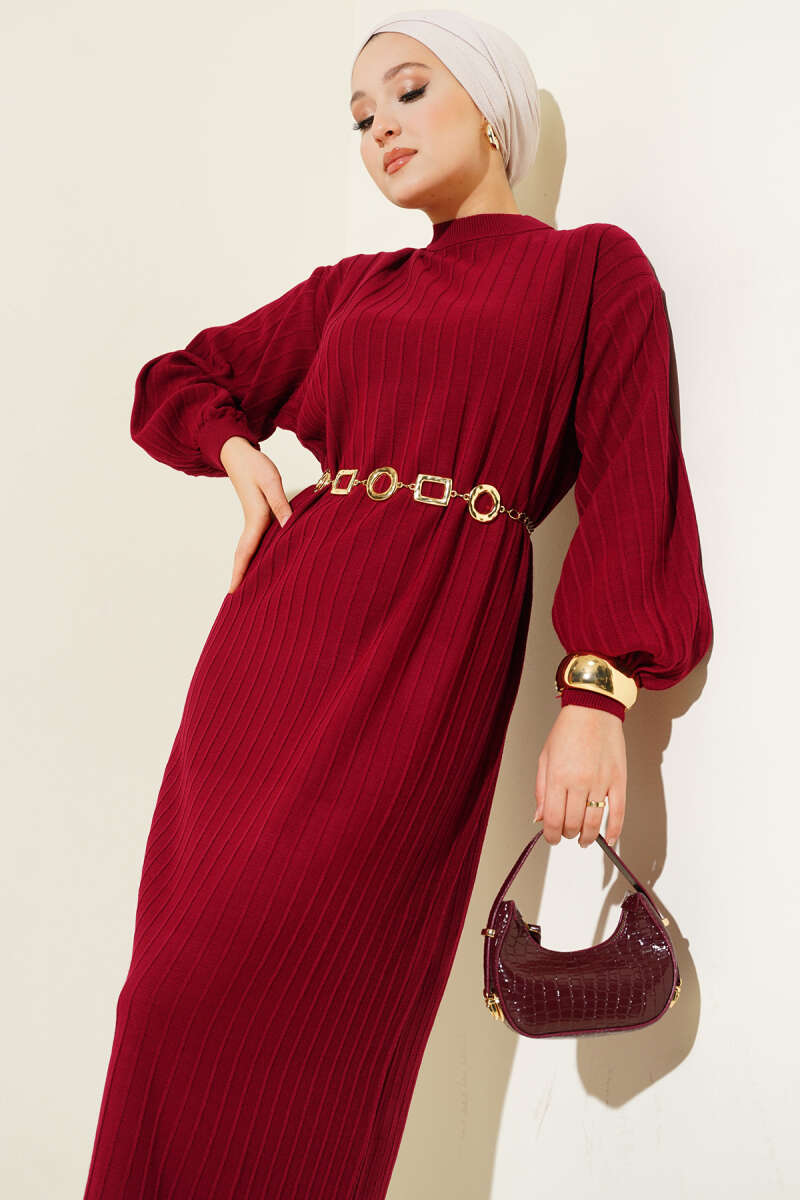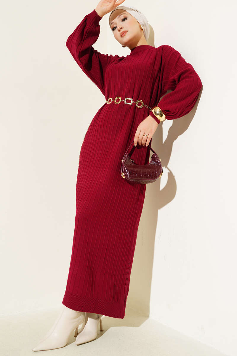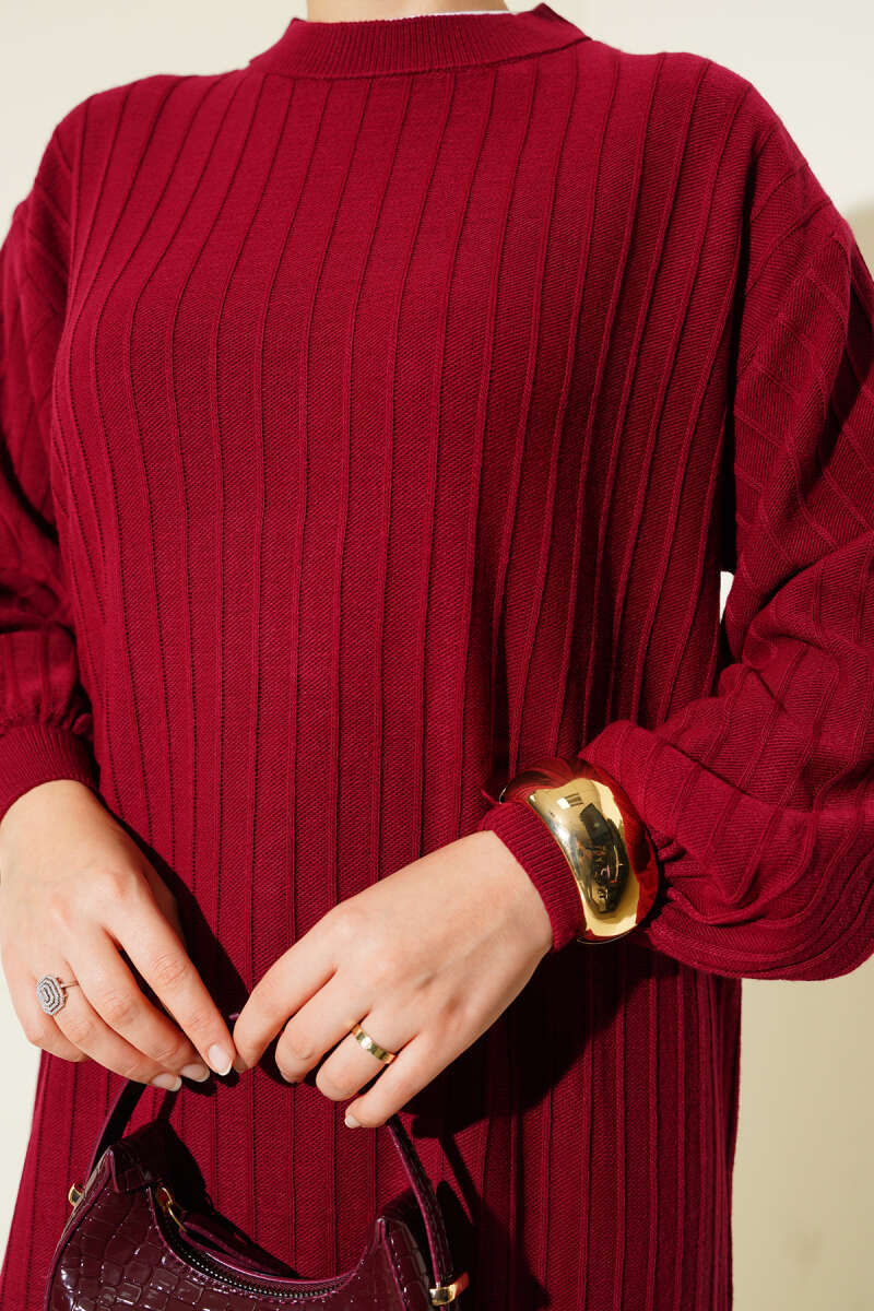 Çizgi Detaylı Balon Kol Triko Elbise Bordo