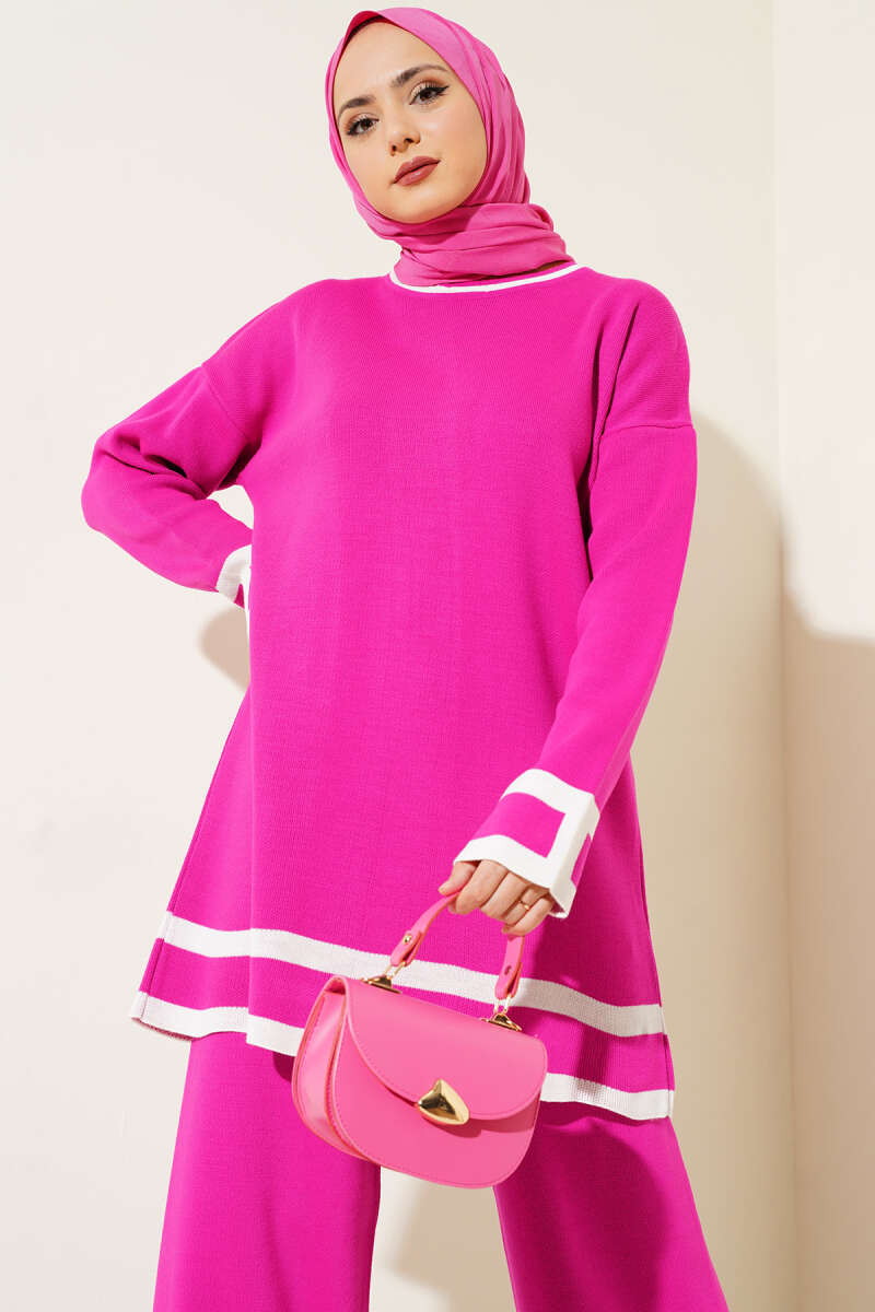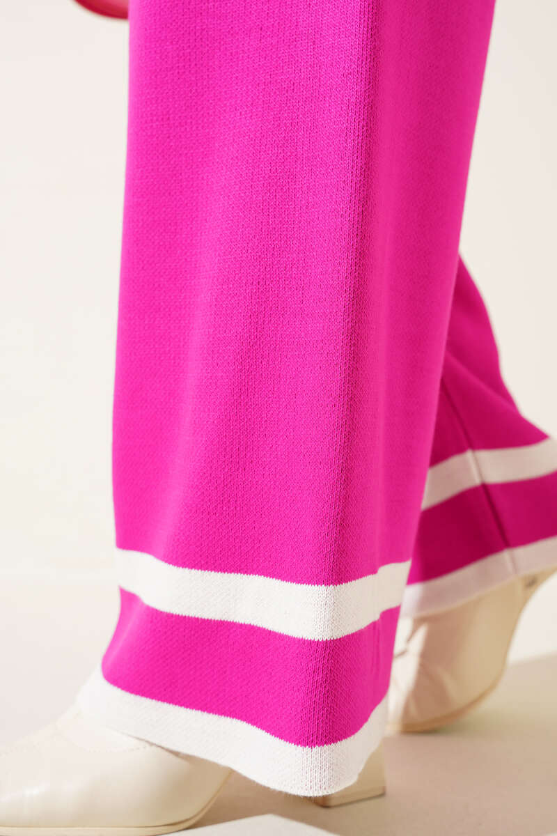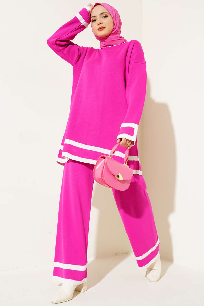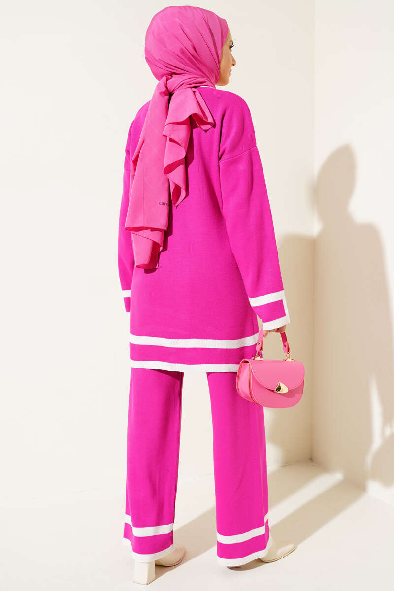 Çizgi Detaylı Basic Triko İkili Takım Fuşya