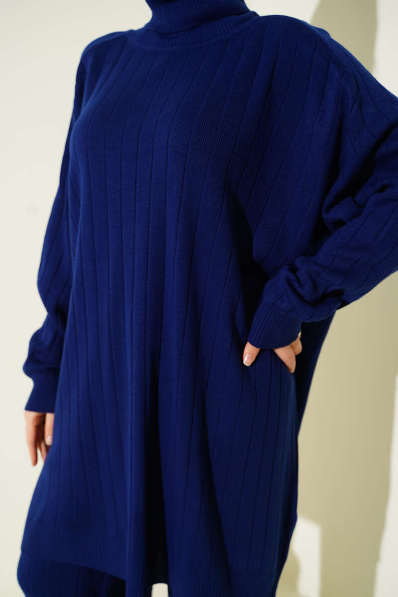 Çizgi Detaylı Boğazlı Oversize Triko İkili Takım Siyah