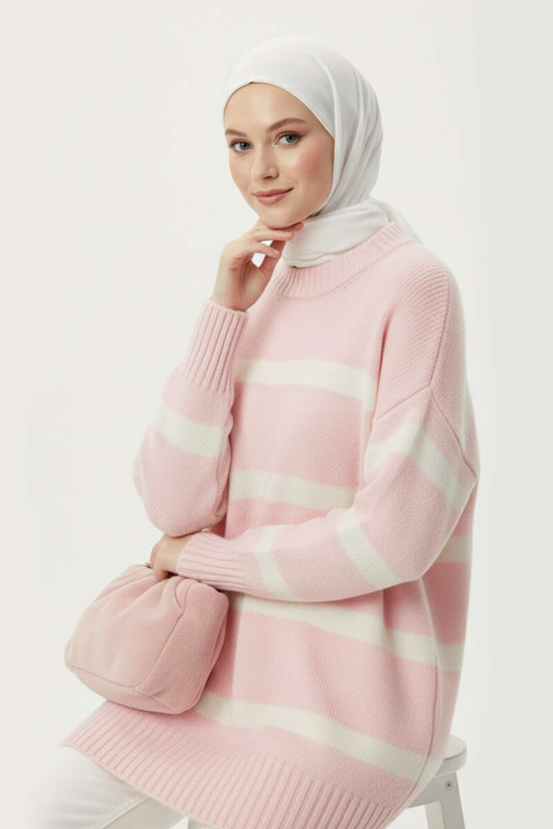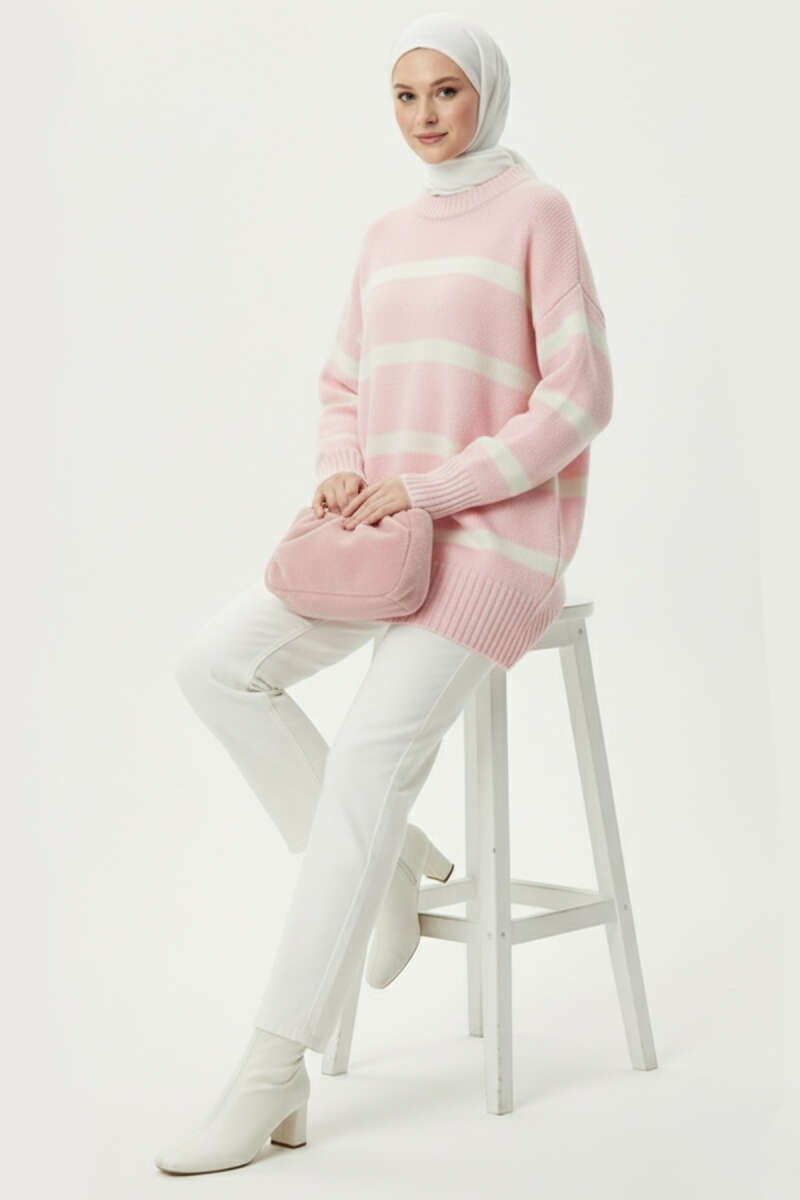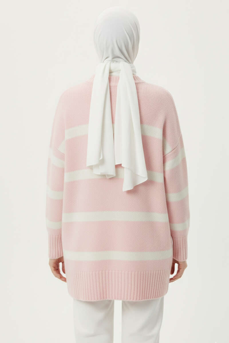 Çizgi Detaylı Şardonlu Kazak Pembe