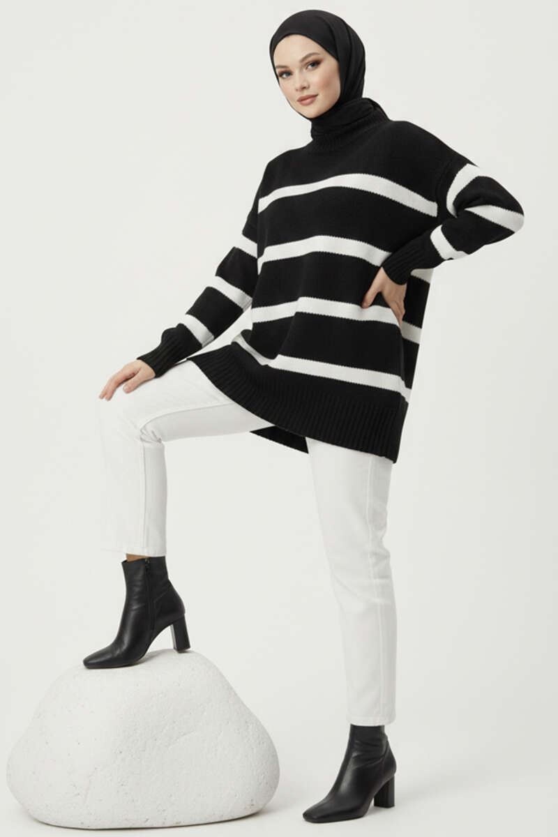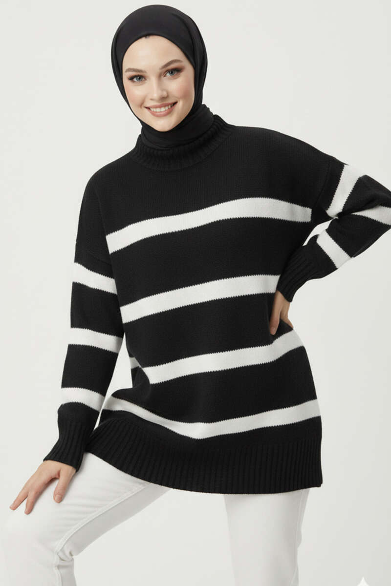 Çizgi Detaylı Şardonlu Kazak Siyah