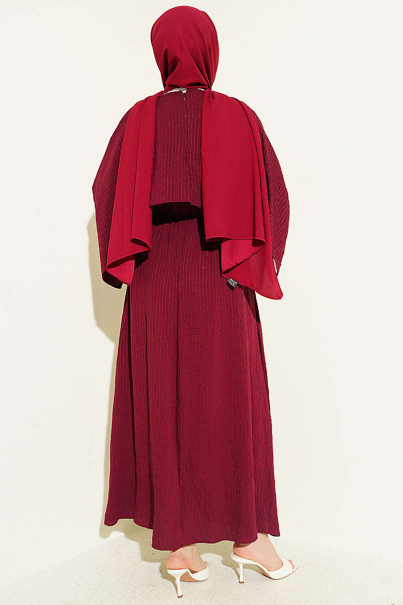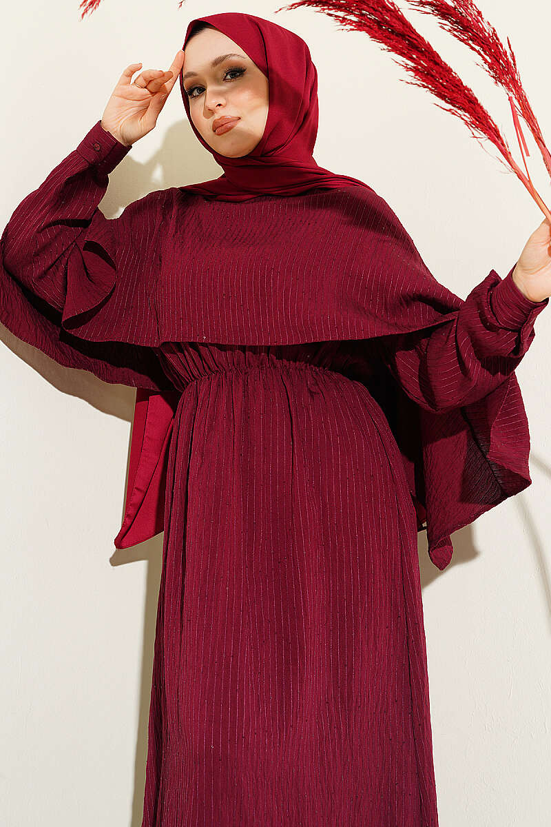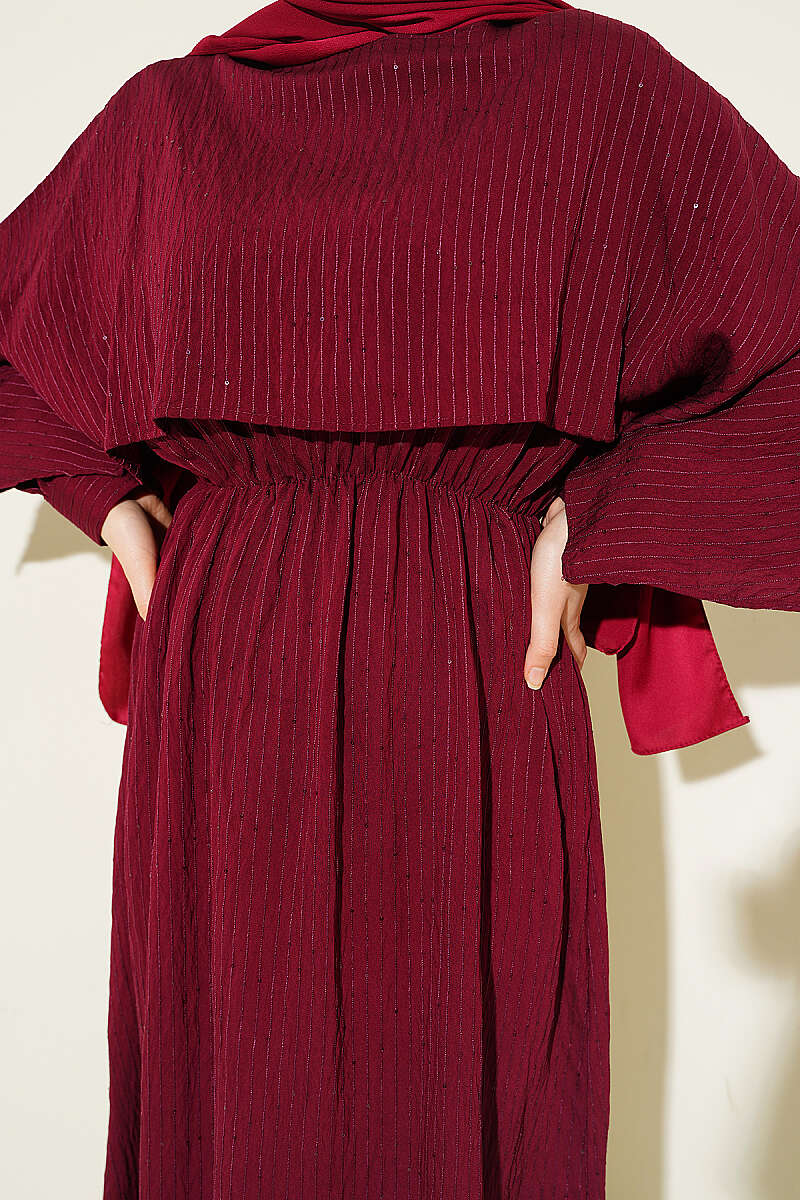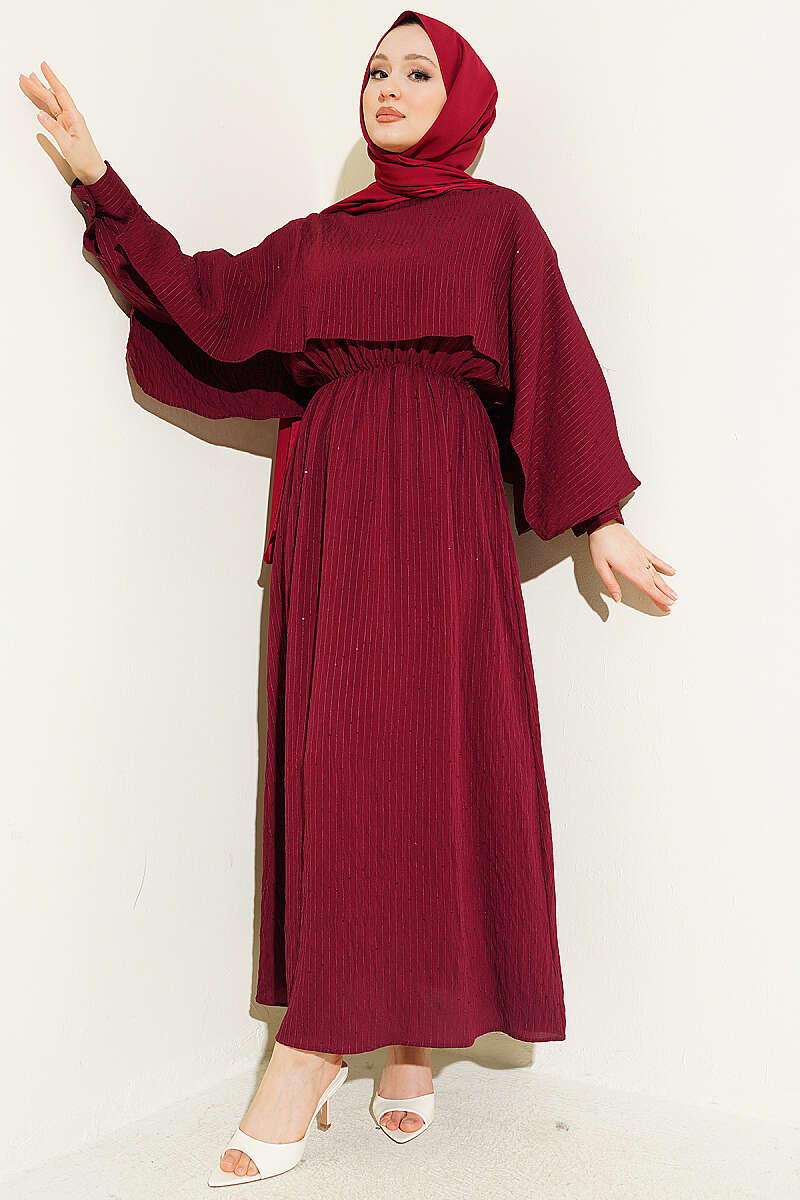 Çizgi Dikişli Bel Lastikli Pelerinli Elbise Bordo