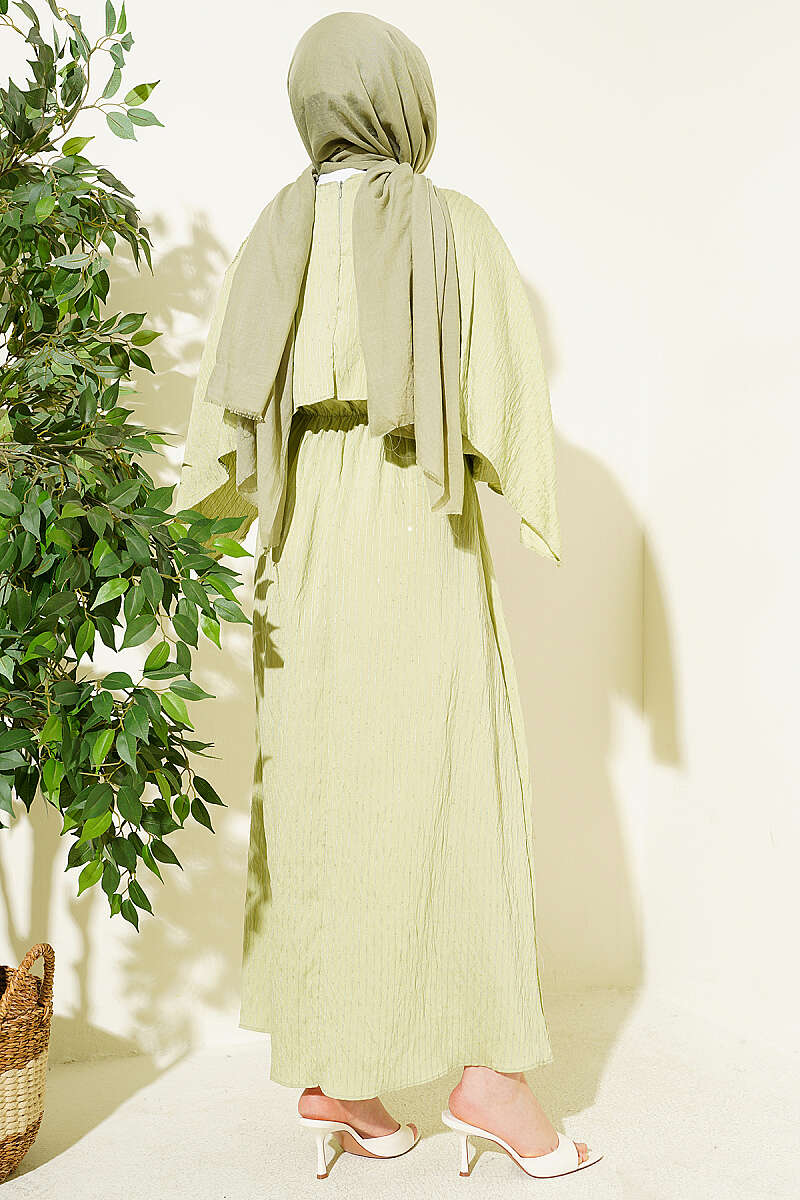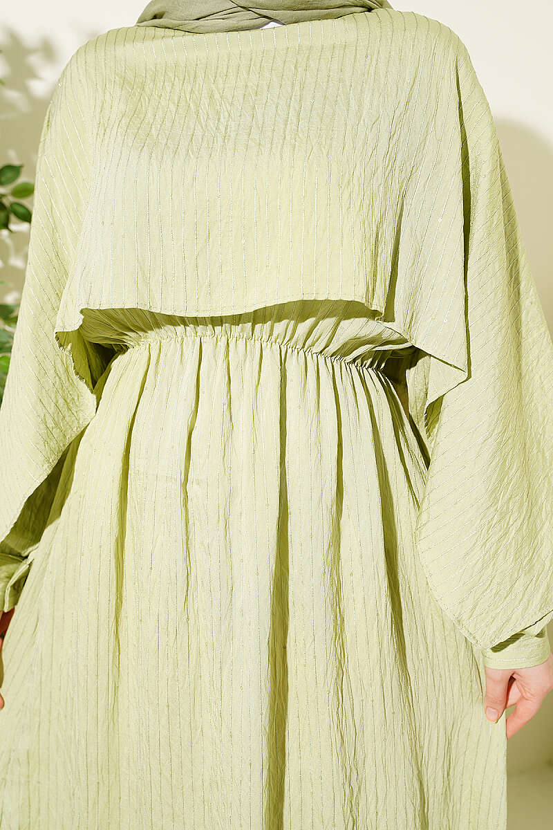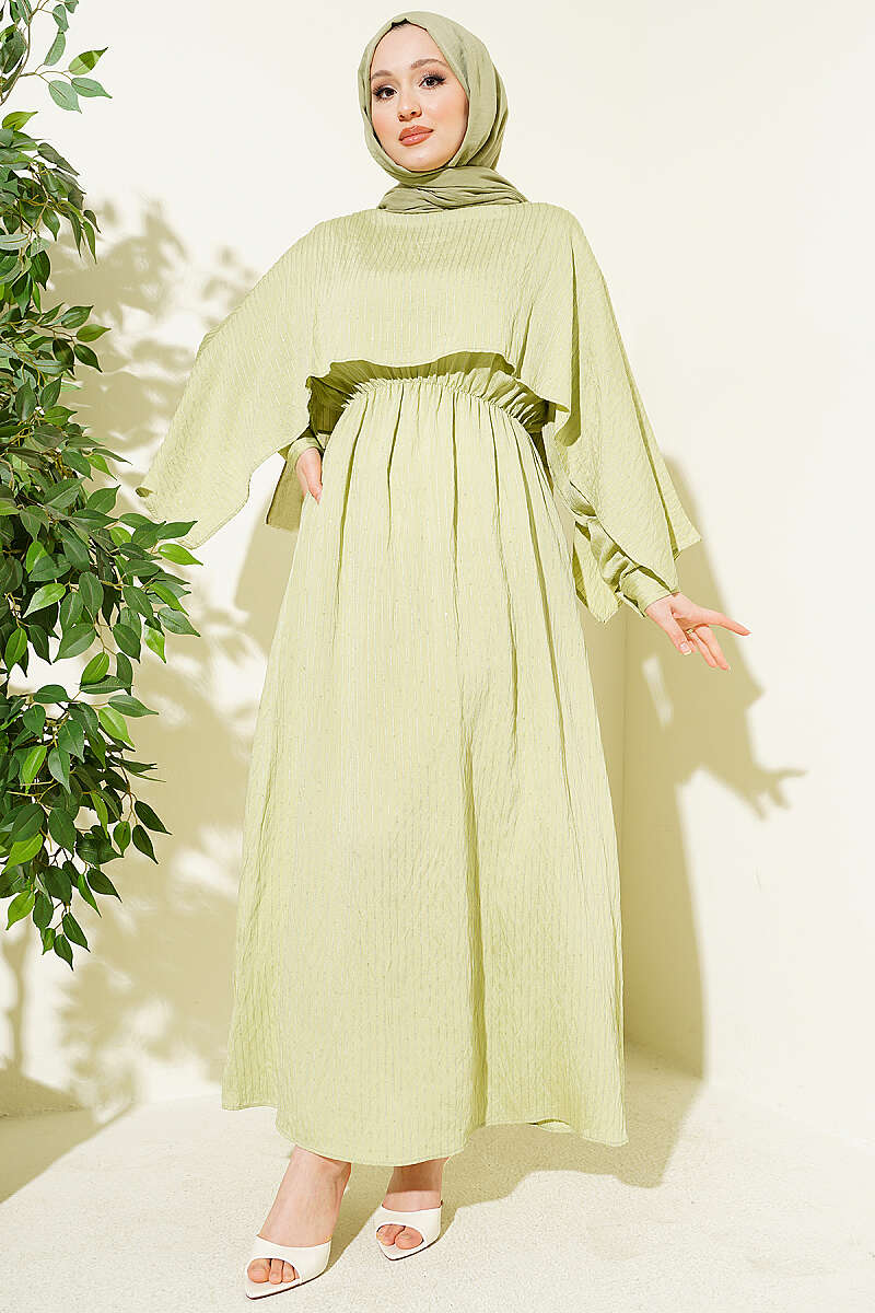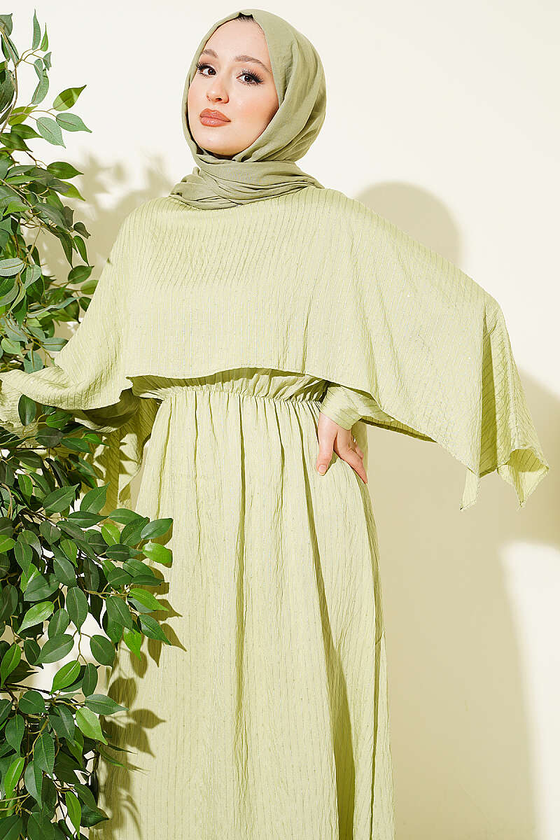 Çizgi Dikişli Bel Lastikli Pelerinli Elbise Çağla Yeşili